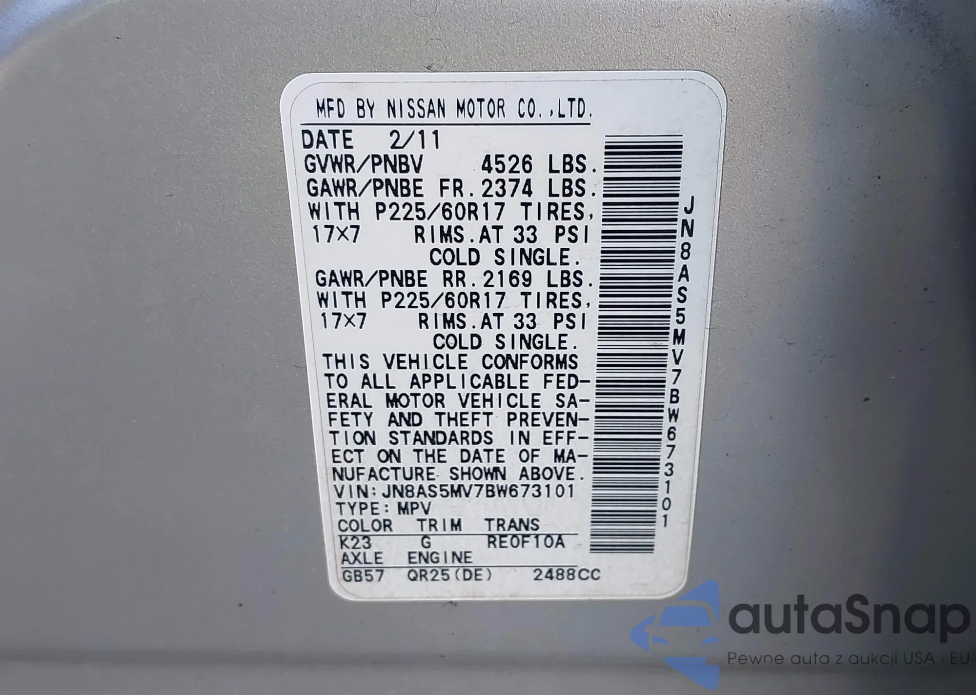 VIN: JN8AS5MV7BW673101