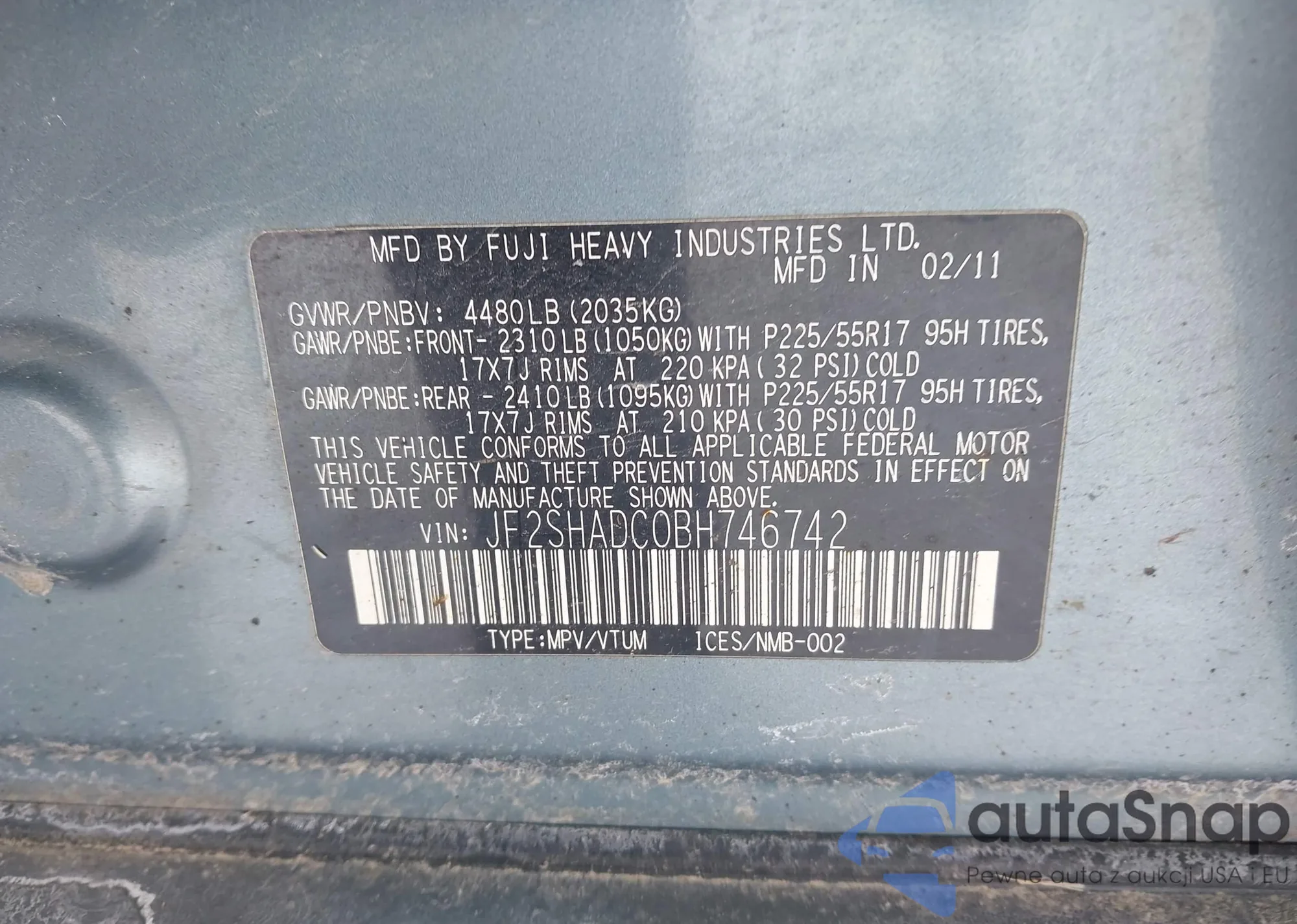 Samochód Subaru Forester 2011 (VIN JF2SHADC0BH746742) nie był wcześniej licytowany. Dokumenty są czyste, przebieg odpowiada lub jest niższy niż średnia rynku. Sprzedaje go firma ubezpieczeniowa – polecamy zakup. Dostawa do portu zajmie ok. 6–8 tygodni.
