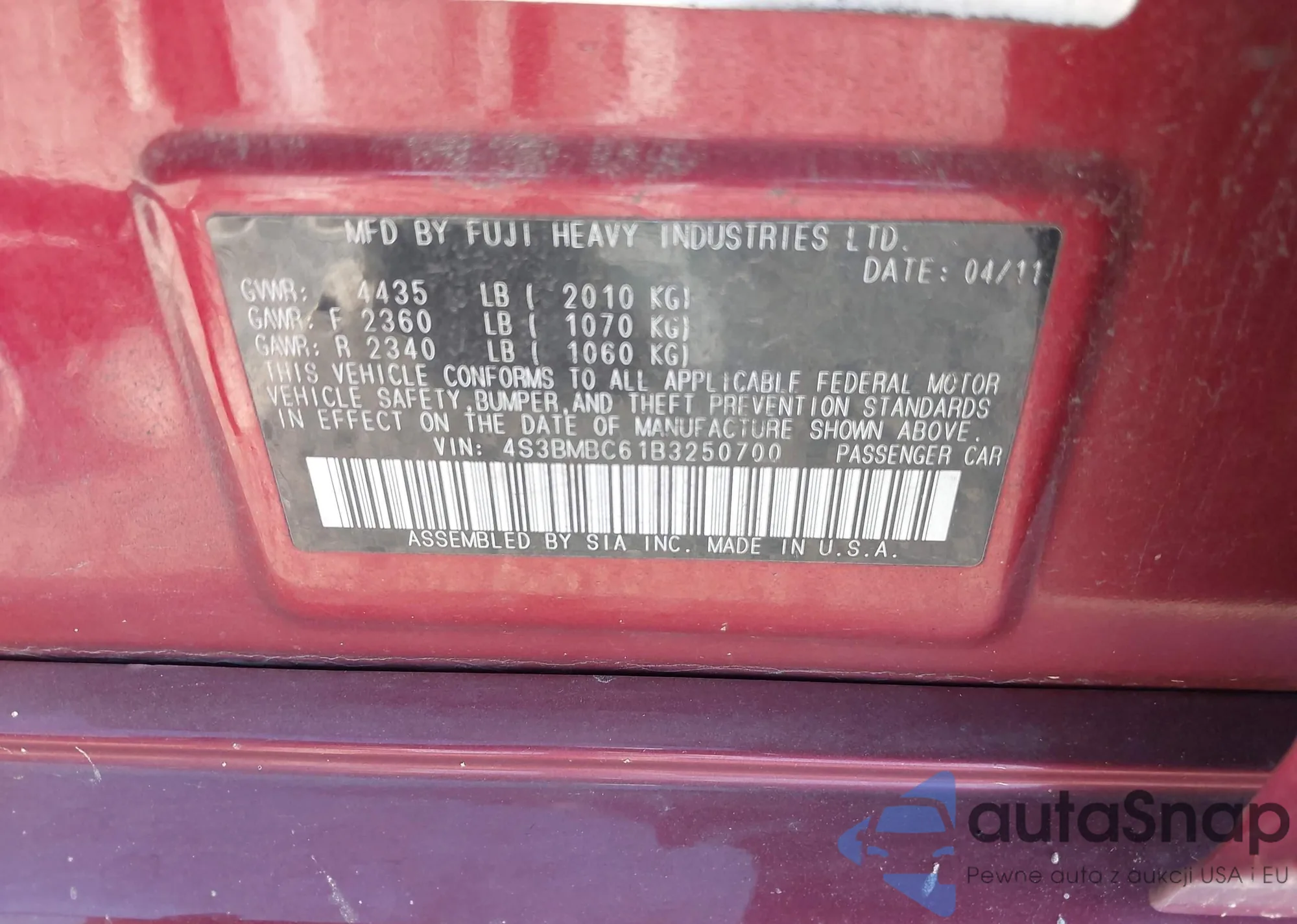 VIN: 4S3BMBC61B3250700