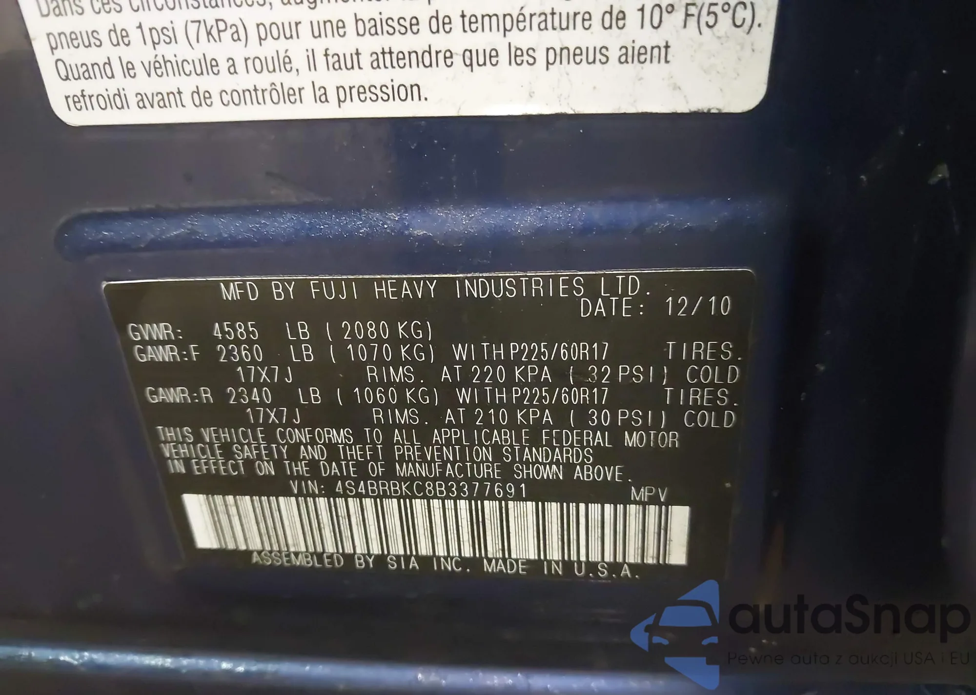 Samochód Subaru Outback 2011 (VIN 4S4BRBKC8B3377691) nie był wcześniej licytowany. Dokumenty są czyste, przebieg odpowiada lub jest niższy niż średnia rynku. Sprzedaje go firma ubezpieczeniowa – polecamy zakup. Dostawa do portu zajmie ok. 6–8 tygodni.