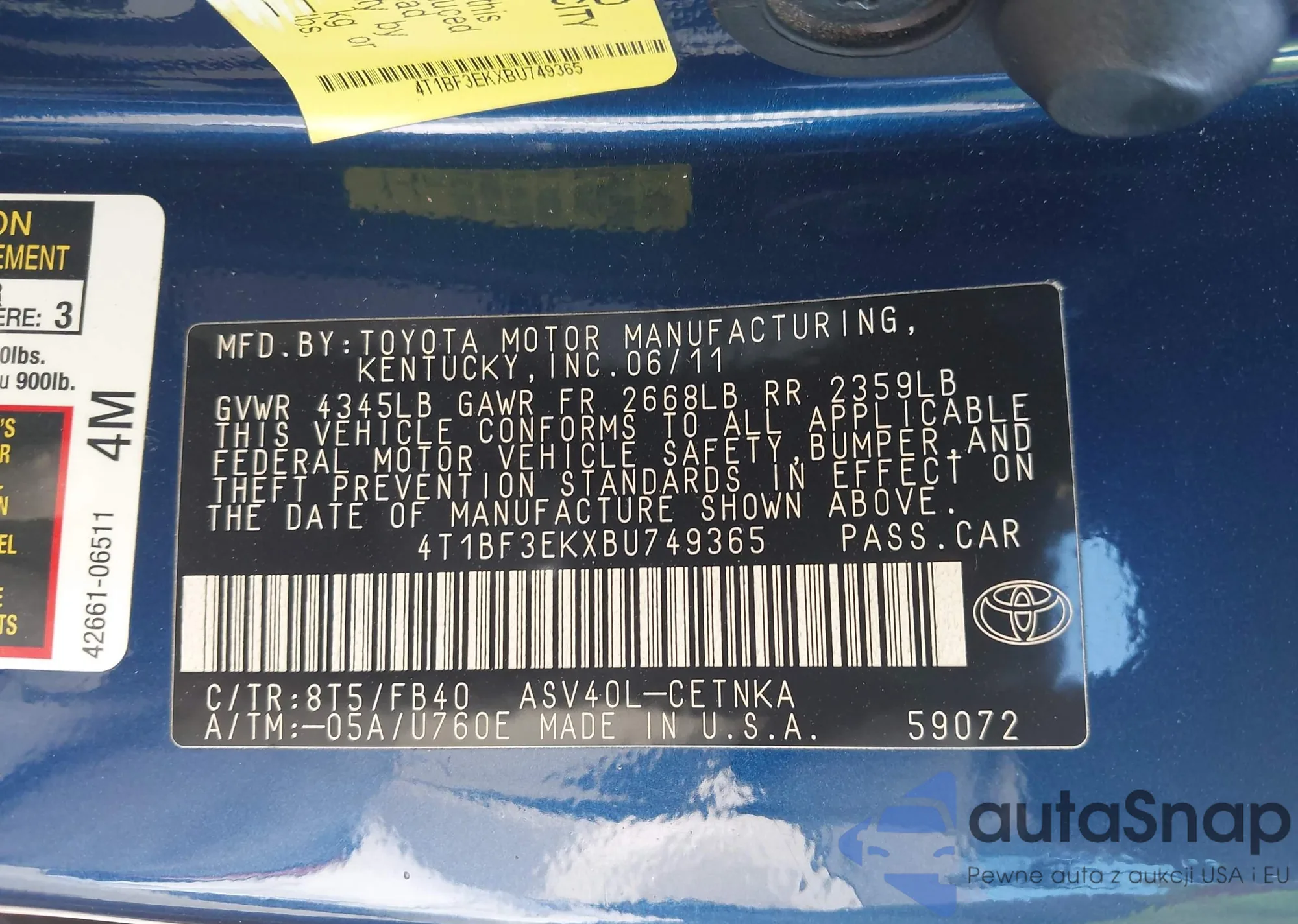 • VIN: 4T1BF3EKXBU749365