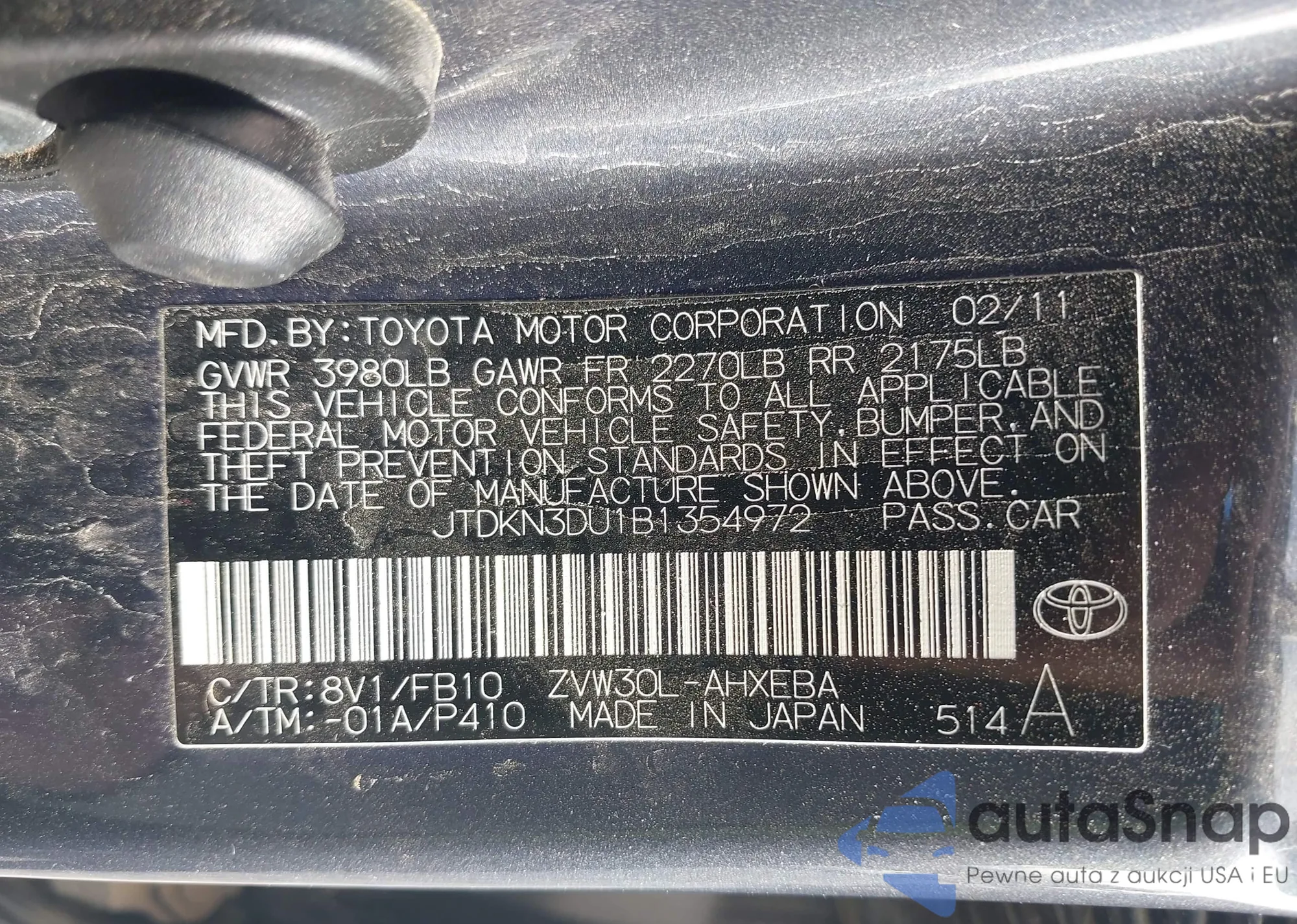 Samochód Toyota Prius 2011 (VIN JTDKN3DU1B1354972) nie był wcześniej licytowany. Dokumenty są czyste, przebieg odpowiada lub jest niższy niż średnia rynku. Sprzedaje go firma ubezpieczeniowa – polecamy zakup. Dostawa do portu zajmie ok. 6–8 tygodni.