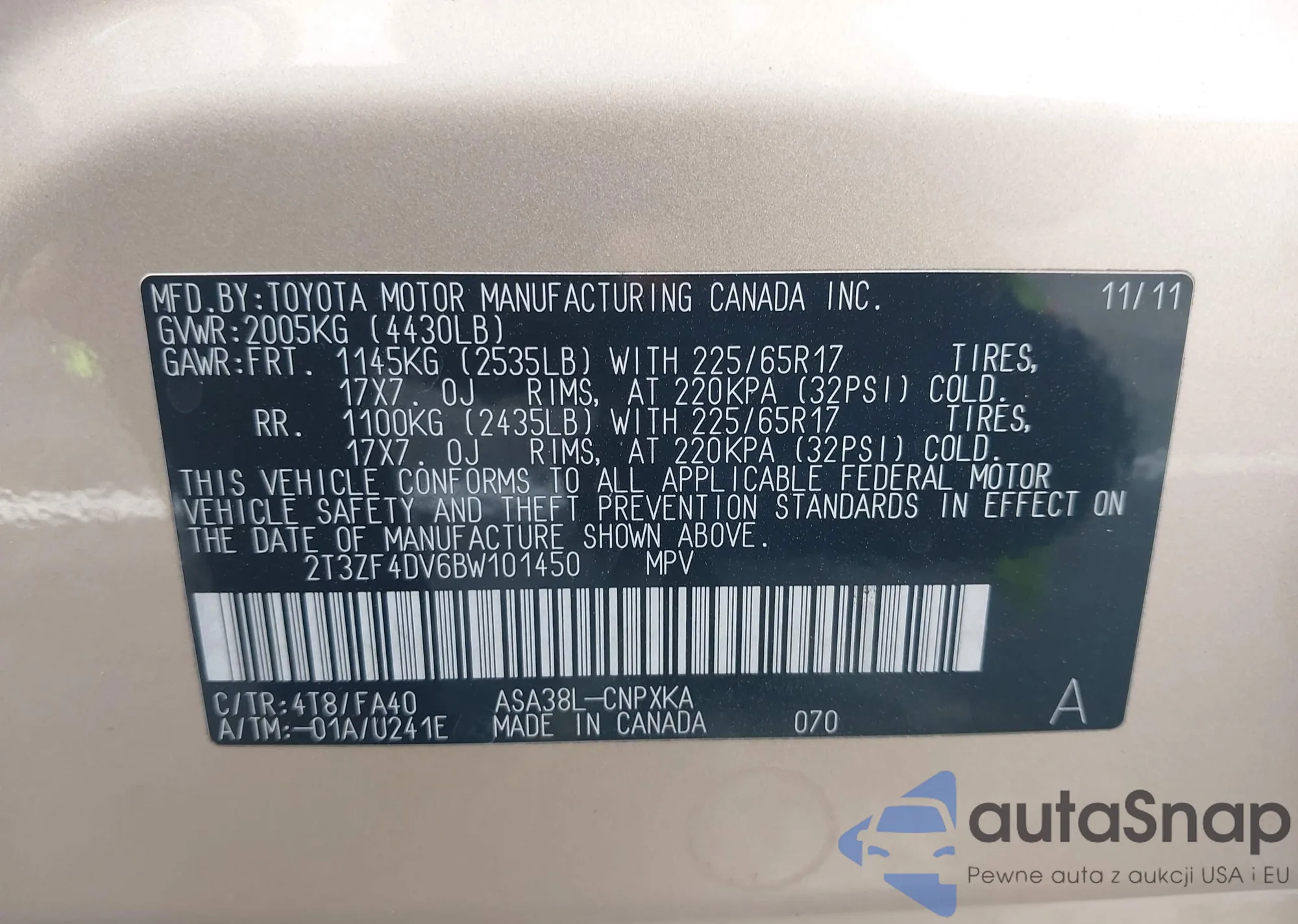 VIN: 2T3ZF4DV6BW101450