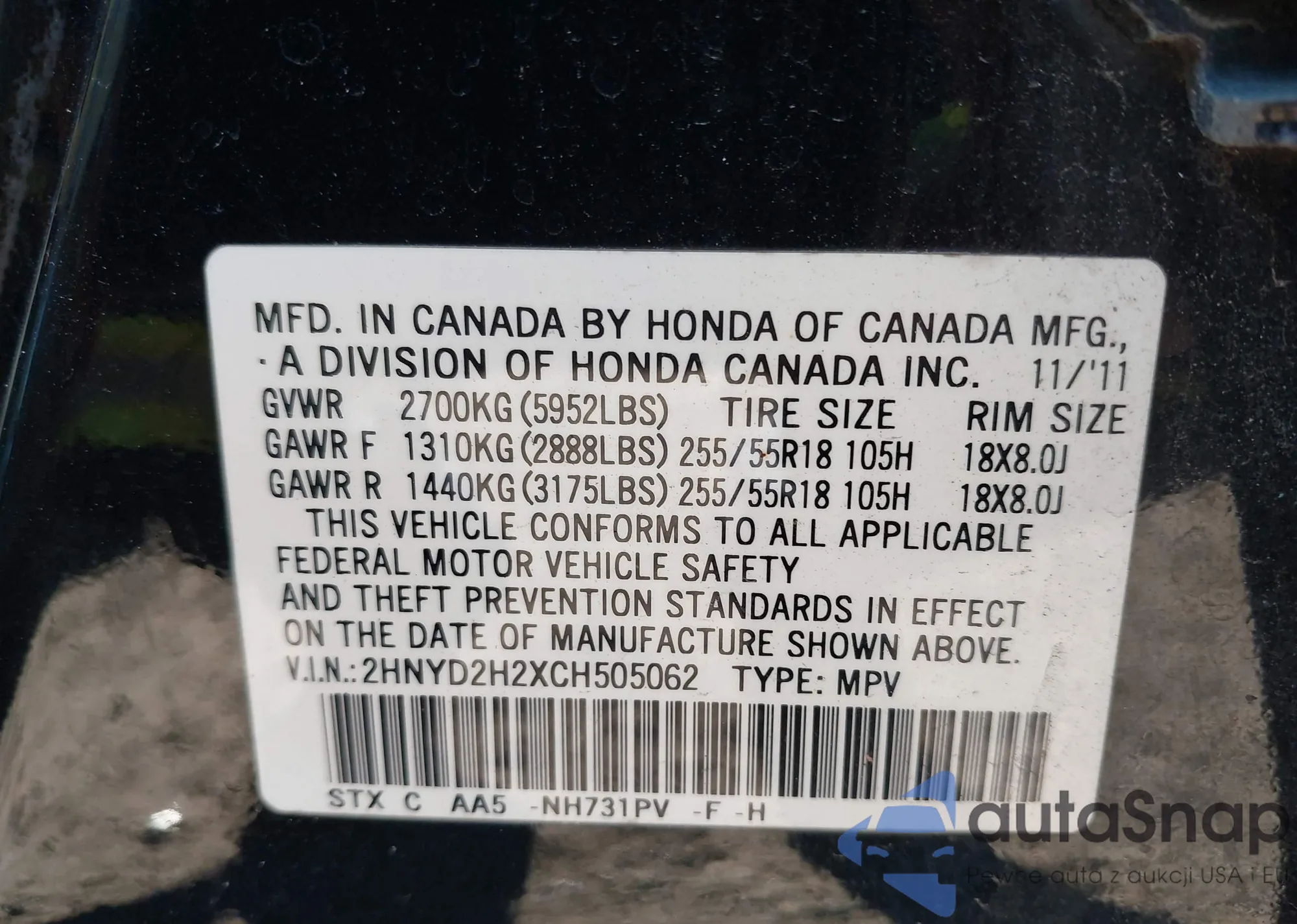 VIN: 2HNYD2H2XCH505062