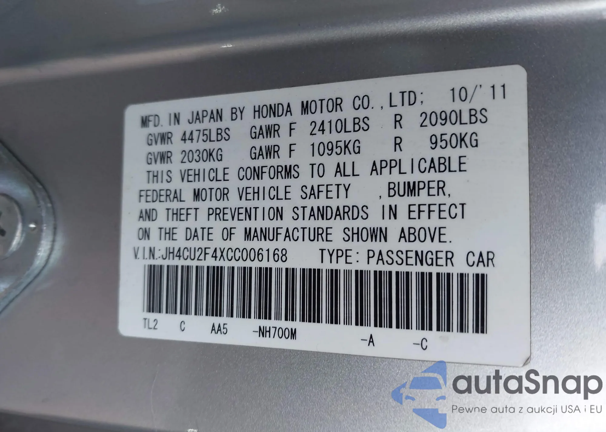 Samochód Acura TSX 2012 (VIN JH4CU2F4XCC006168) nie był wcześniej licytowany. Dokumenty są czyste, przebieg odpowiada lub jest niższy niż średnia rynku. Sprzedaje go firma ubezpieczeniowa – polecamy zakup. Dostawa do portu zajmie ok. 6–8 tygodni.