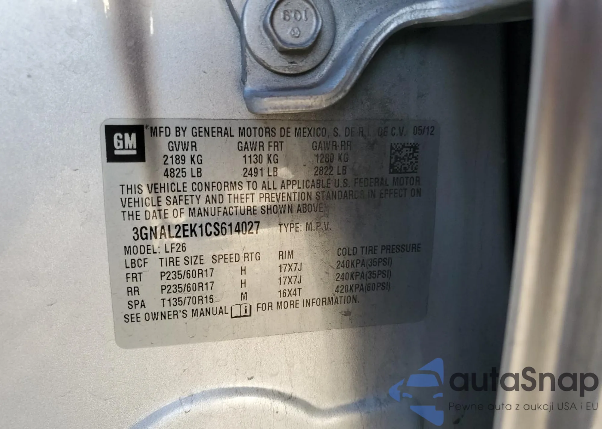 Samochód Chevrolet Captiva 2012 (VIN 3GNAL2EK1CS614027) sprzedaje go niezweryfikowany sprzedawca. Zalecamy raport Carfax i potwierdzenie możliwości rejestracji pojazdu przed zakupem.