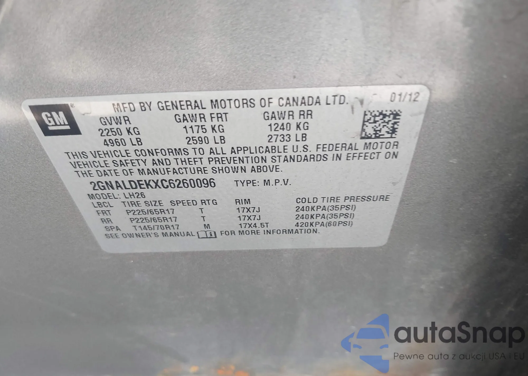 • VIN: 2GNALDEKXC6260096