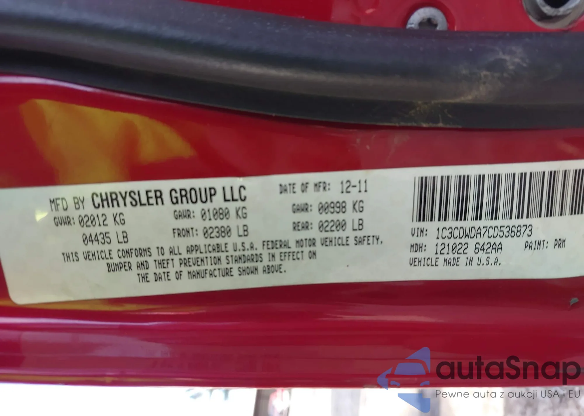• VIN: 1C3CDWDA7CD536873