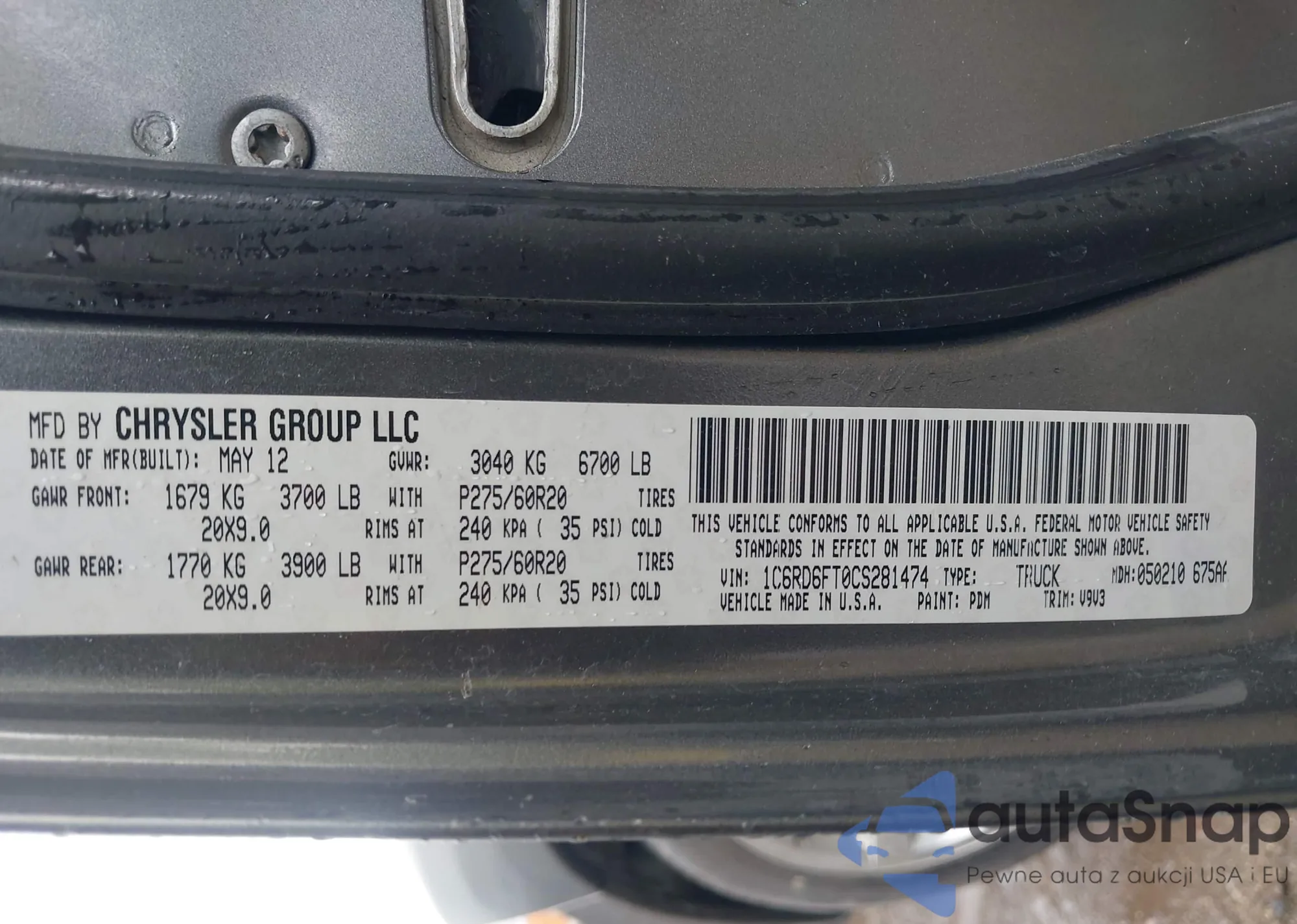 VIN: 1C6RD6FT0CS281474