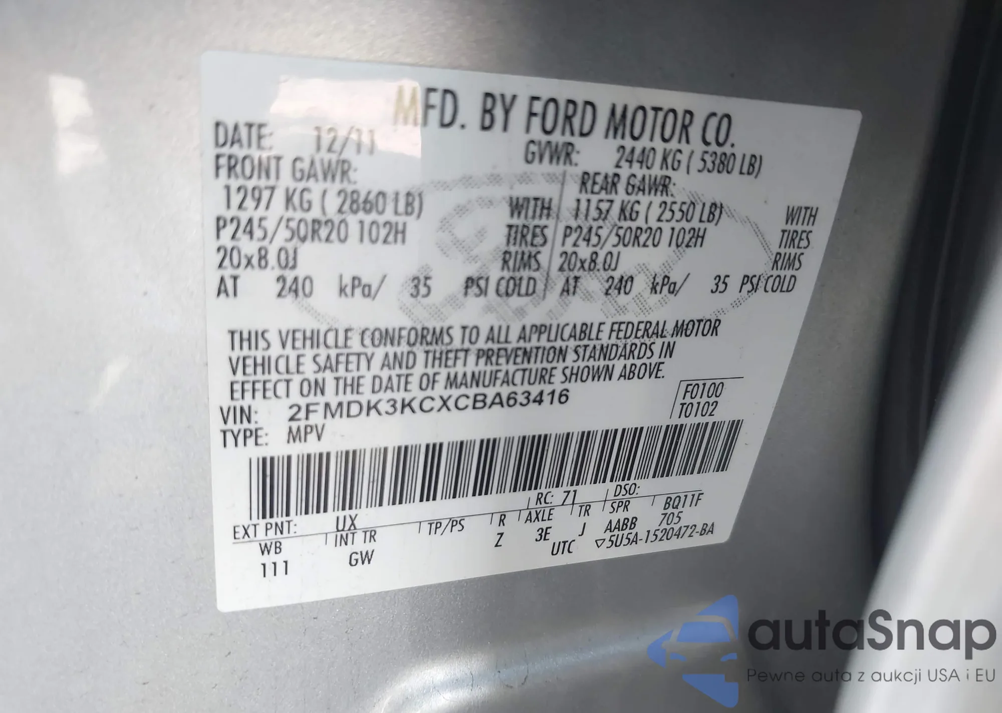 • VIN: 2FMDK3KCXCBA63416