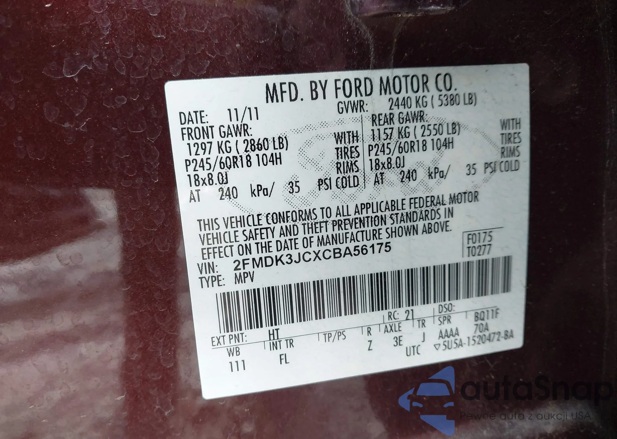 Samochód Ford Edge 2012 (VIN 2FMDK3JCXCBA56175) nie był wcześniej licytowany. Dokumenty są czyste, przebieg odpowiada lub jest niższy niż średnia rynku. Sprzedaje go firma ubezpieczeniowa – polecamy zakup. Dostawa do portu zajmie ok. 6–8 tygodni.