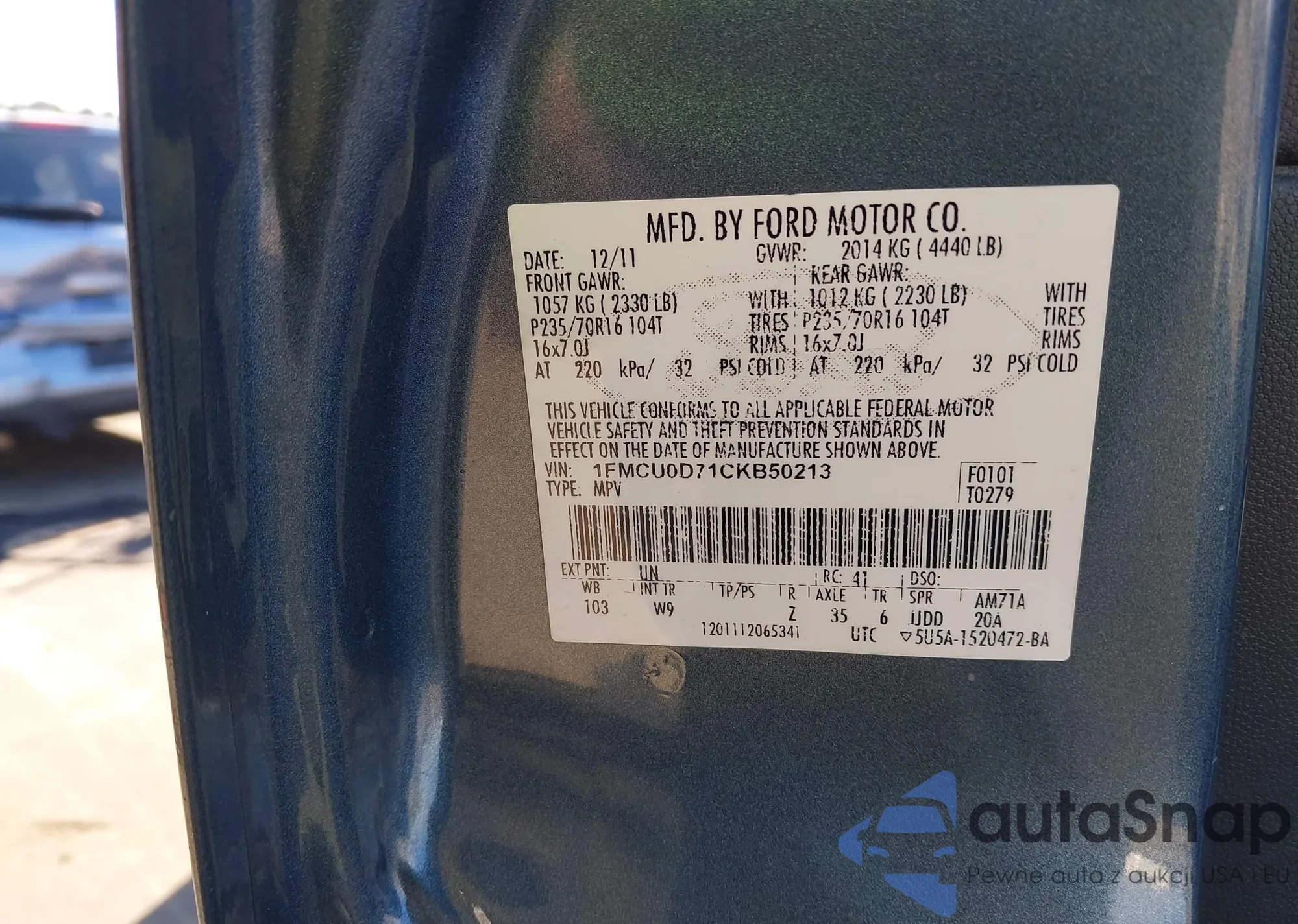 Samochód Ford Escape 2012 (VIN 1FMCU0D71CKB50213) nie był wcześniej licytowany. Dokumenty są czyste, przebieg odpowiada lub jest niższy niż średnia rynku. Sprzedaje go firma ubezpieczeniowa – polecamy zakup. Dostawa do portu zajmie ok. 6–8 tygodni.