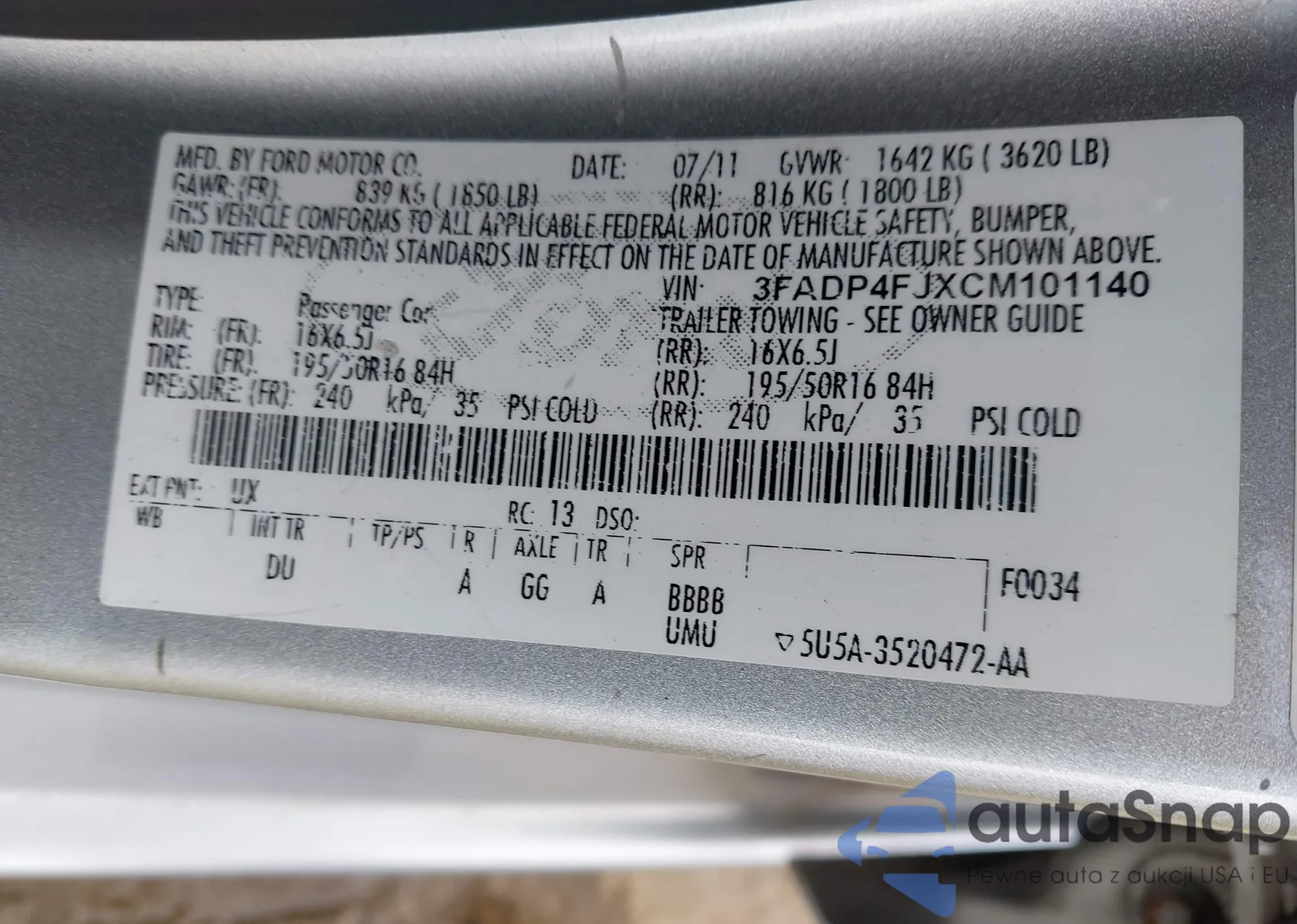 VIN: 3FADP4FJXCM101140