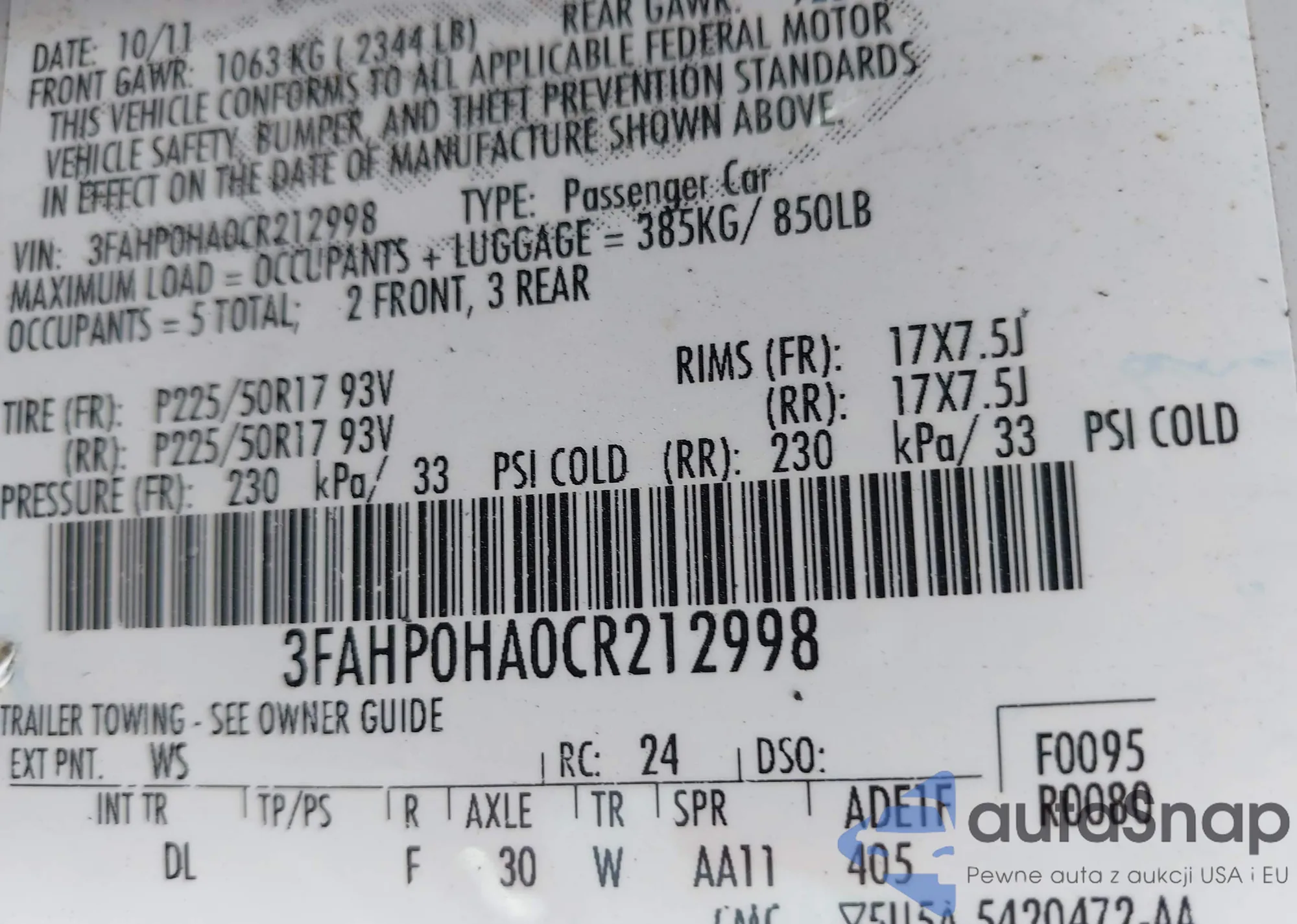 VIN: 3FAHP0HA0CR212998