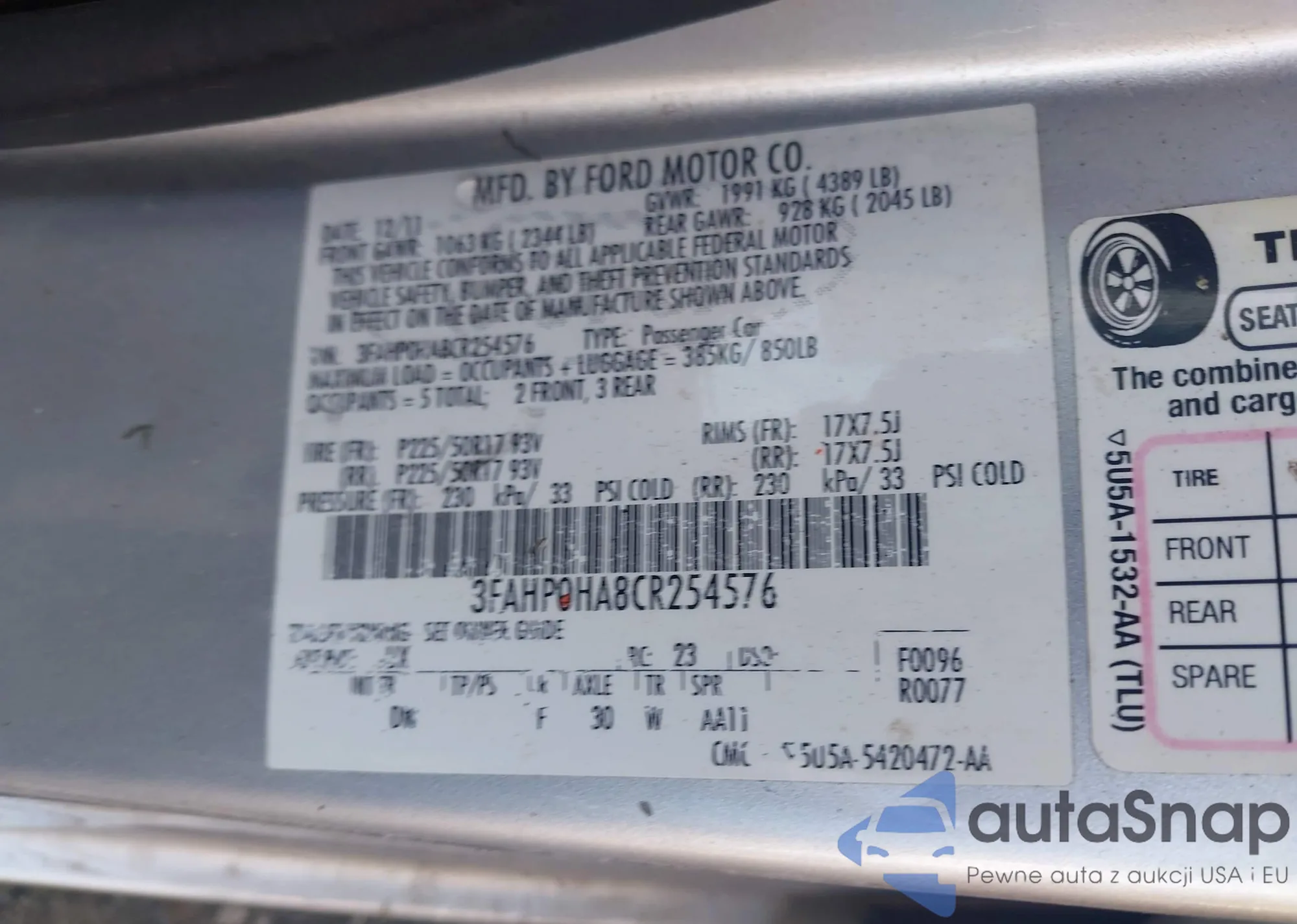 • VIN: 3FAHP0HA8CR254576