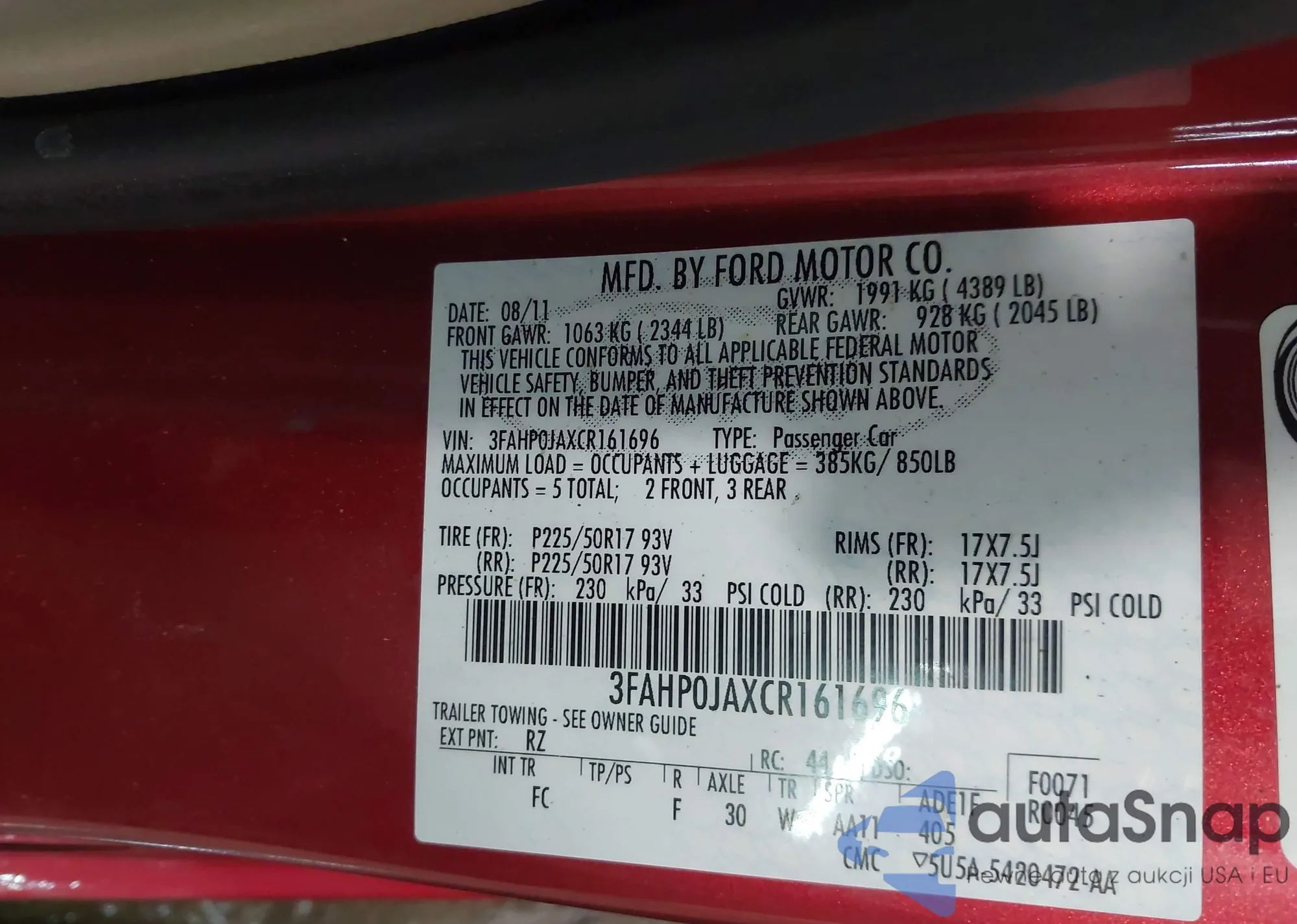 VIN: 3FAHP0JAXCR161696