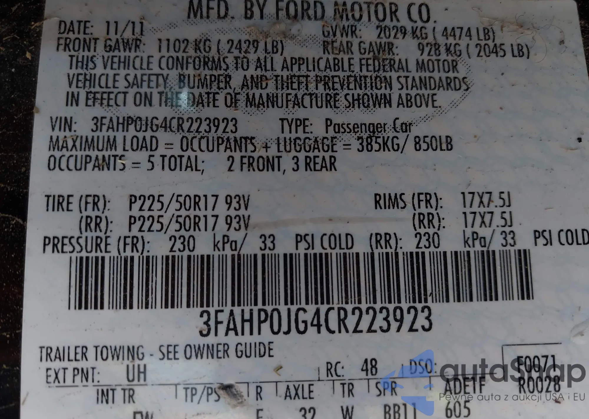 VIN: 3FAHP0JG4CR223923
