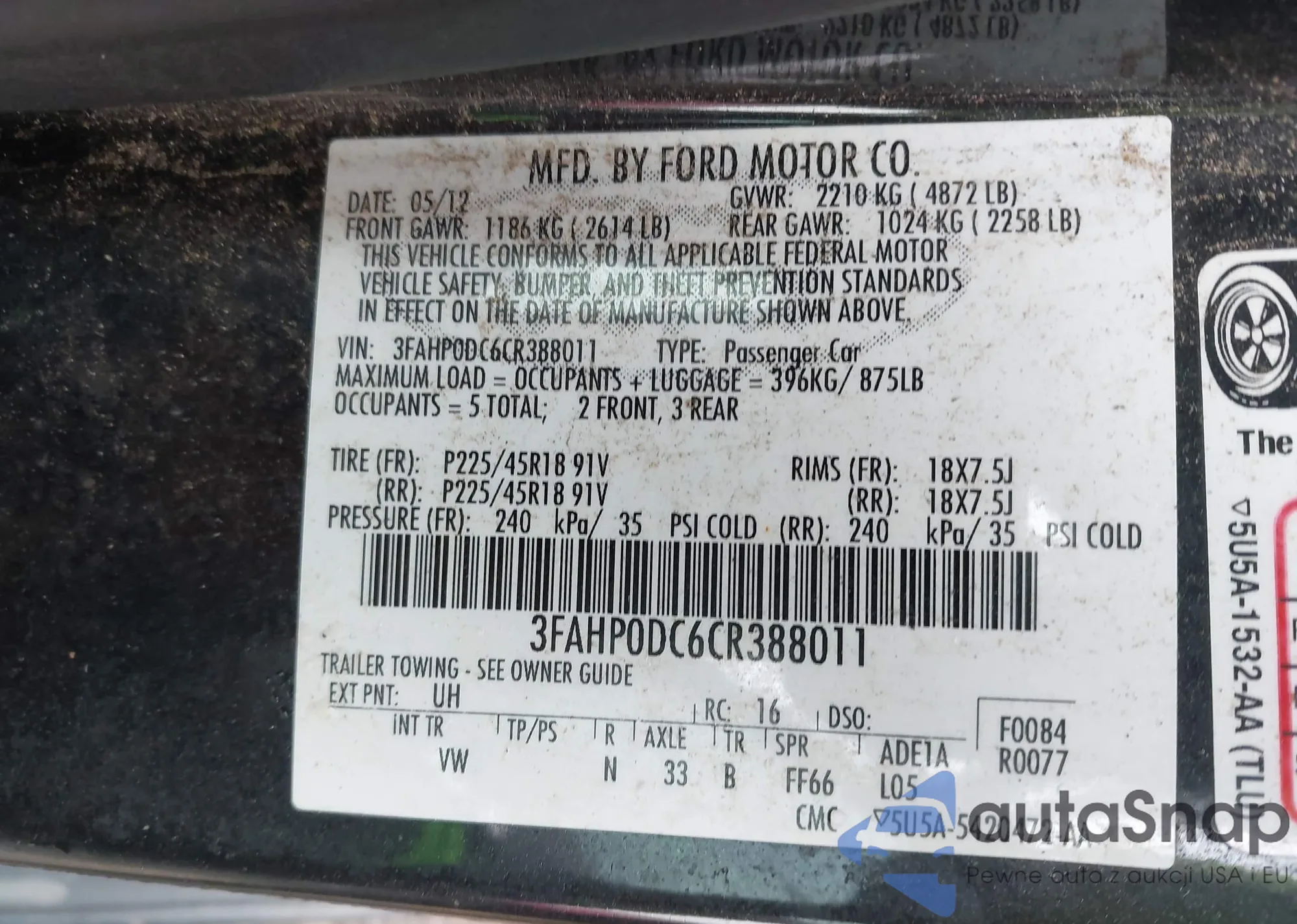 VIN: 3FAHP0DC6CR388011