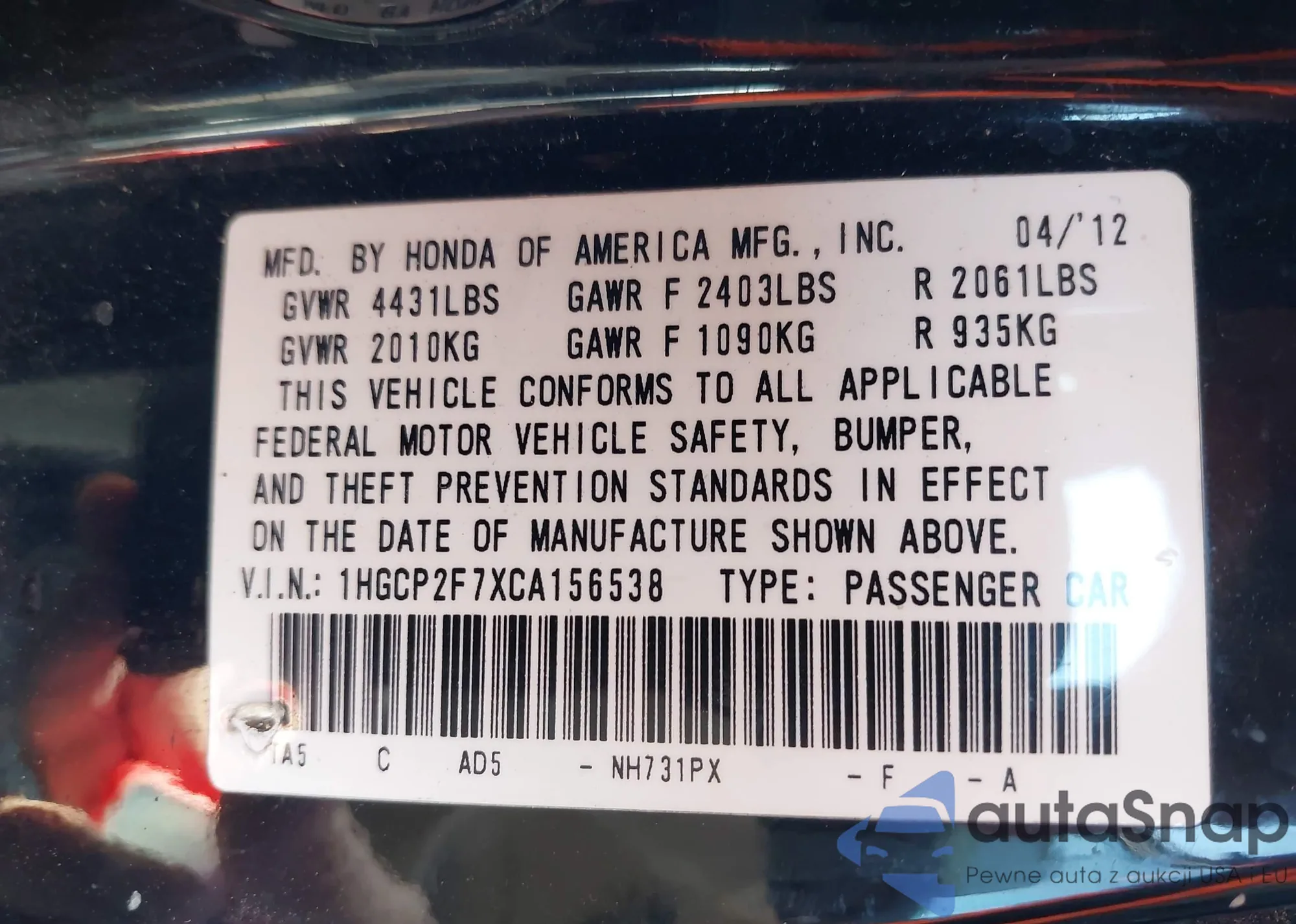 • VIN: 1HGCP2F7XCA156538