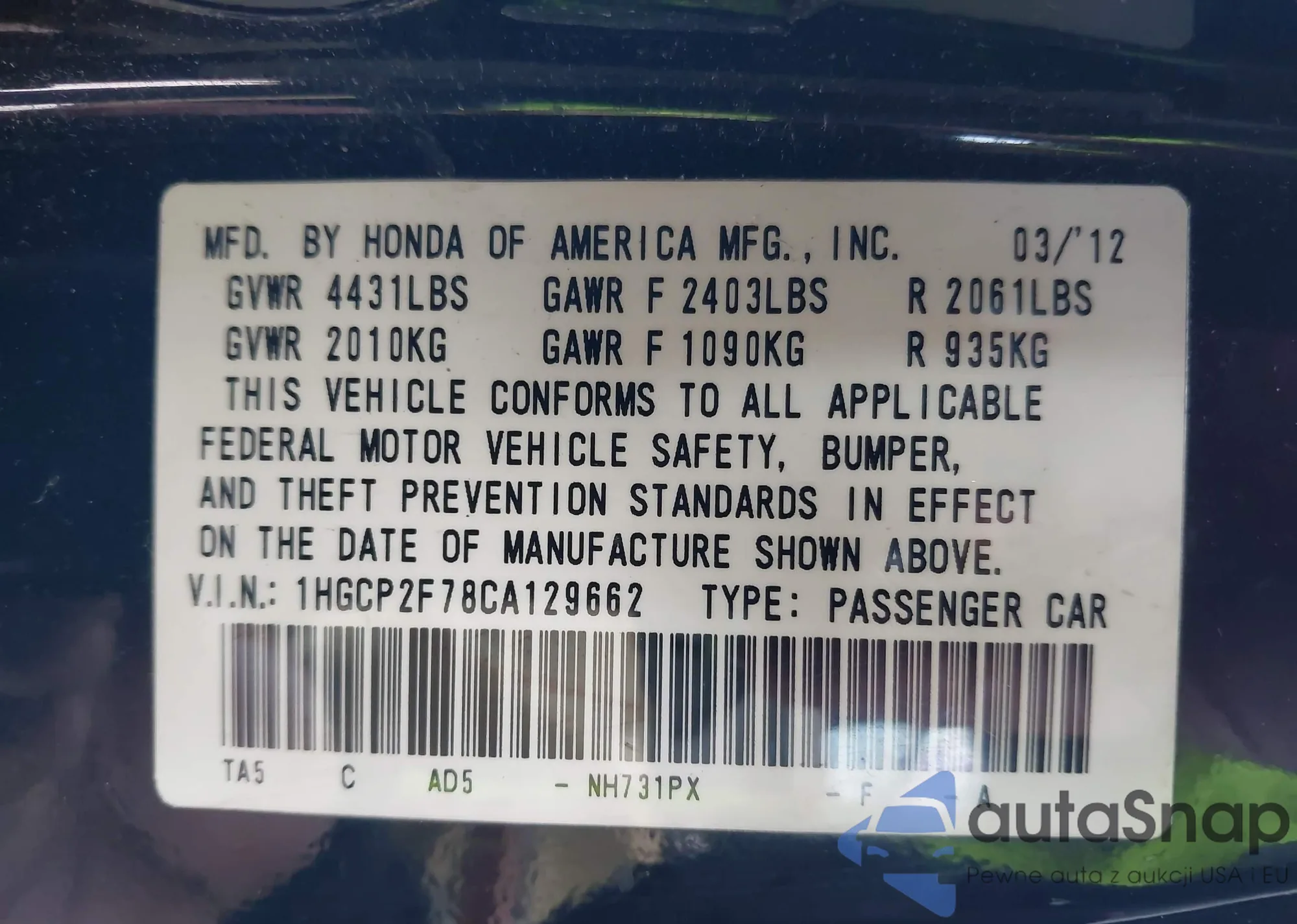 Samochód Honda Accord 2012 (VIN 1HGCP2F78CA129662) nie był wcześniej licytowany. Dokumenty są czyste, przebieg odpowiada lub jest niższy niż średnia rynku. Sprzedaje go firma ubezpieczeniowa – polecamy zakup. Dostawa do portu zajmie ok. 6–8 tygodni.