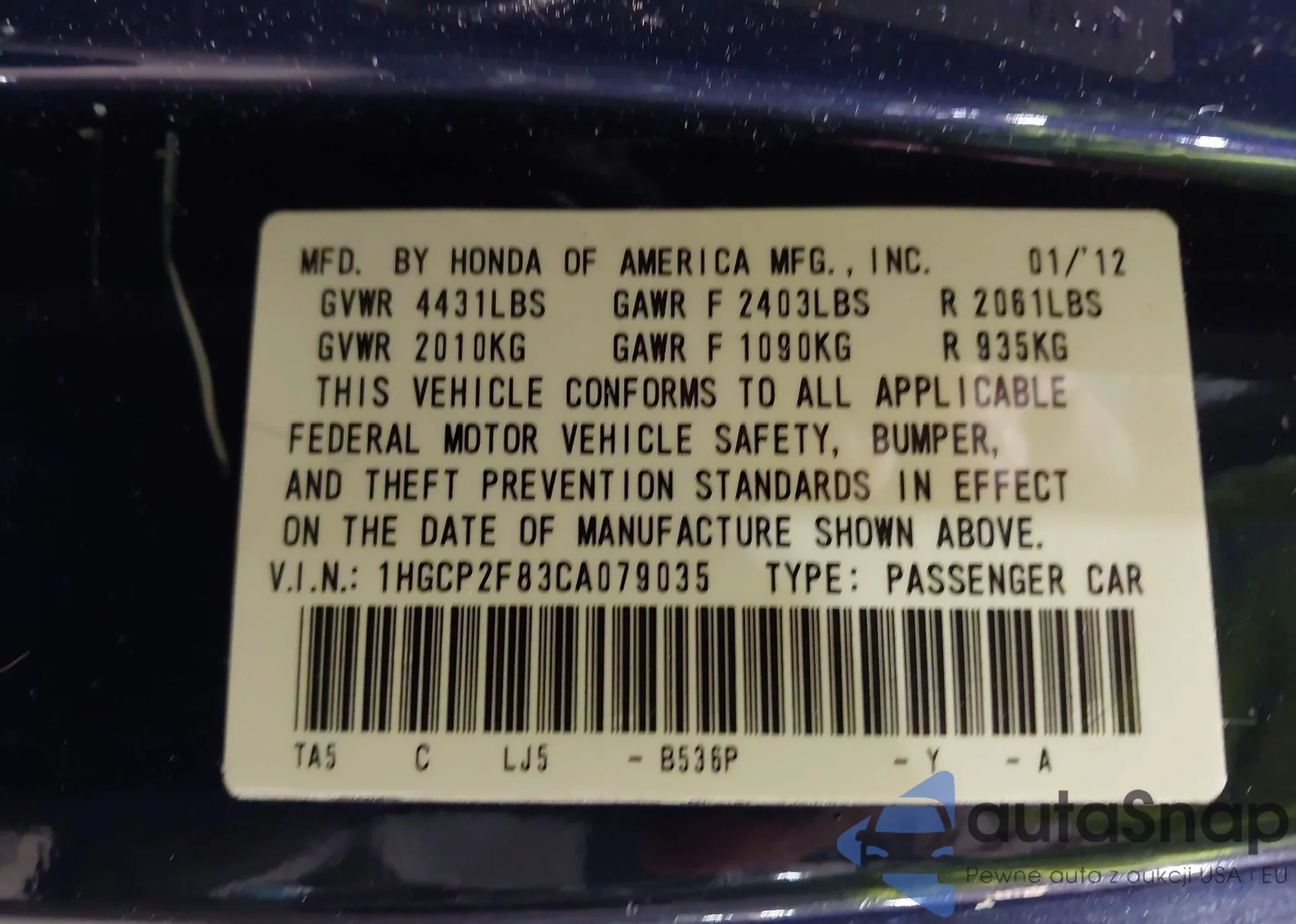 Samochód Honda Accord 2012 (VIN 1HGCP2F83CA079035) nie był wcześniej licytowany. Dokumenty są czyste, przebieg odpowiada lub jest niższy niż średnia rynku. Sprzedaje go firma ubezpieczeniowa – polecamy zakup. Dostawa do portu zajmie ok. 6–8 tygodni.