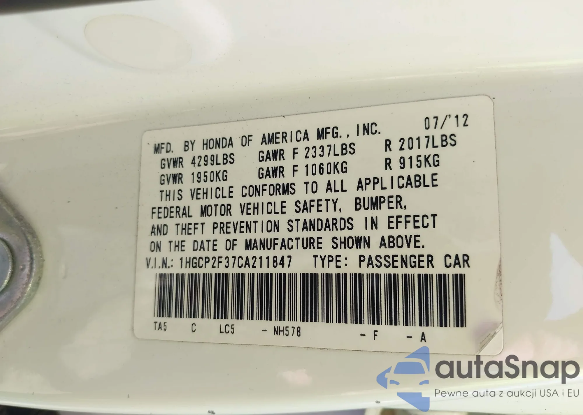 VIN: 1HGCP2F37CA211847