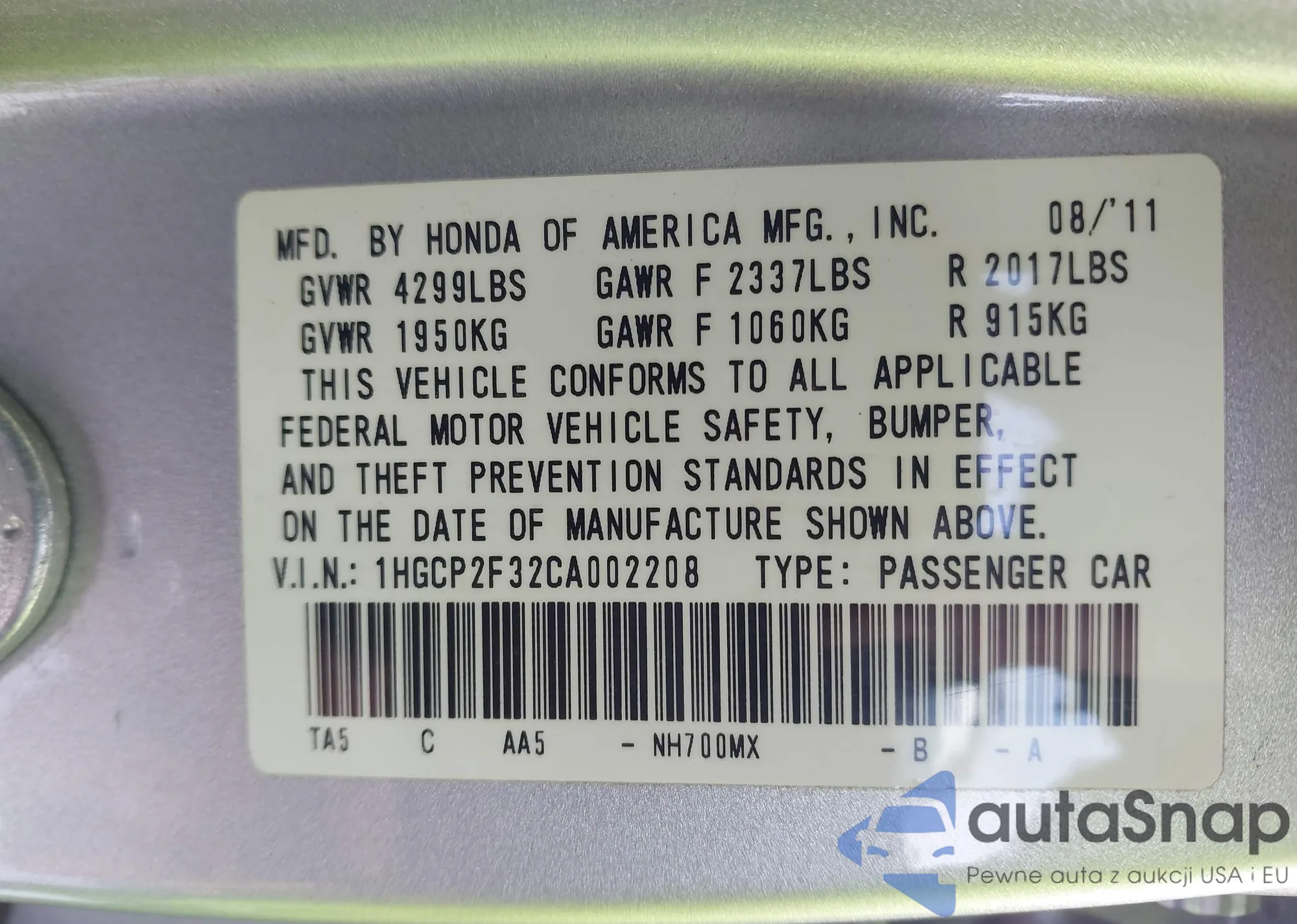 VIN: 1HGCP2F32CA002208