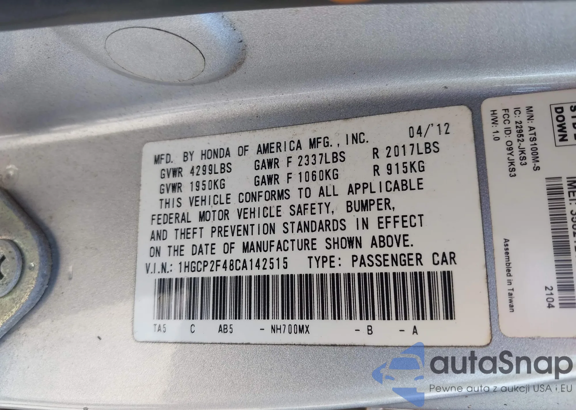 VIN: 1HGCP2F48CA142515