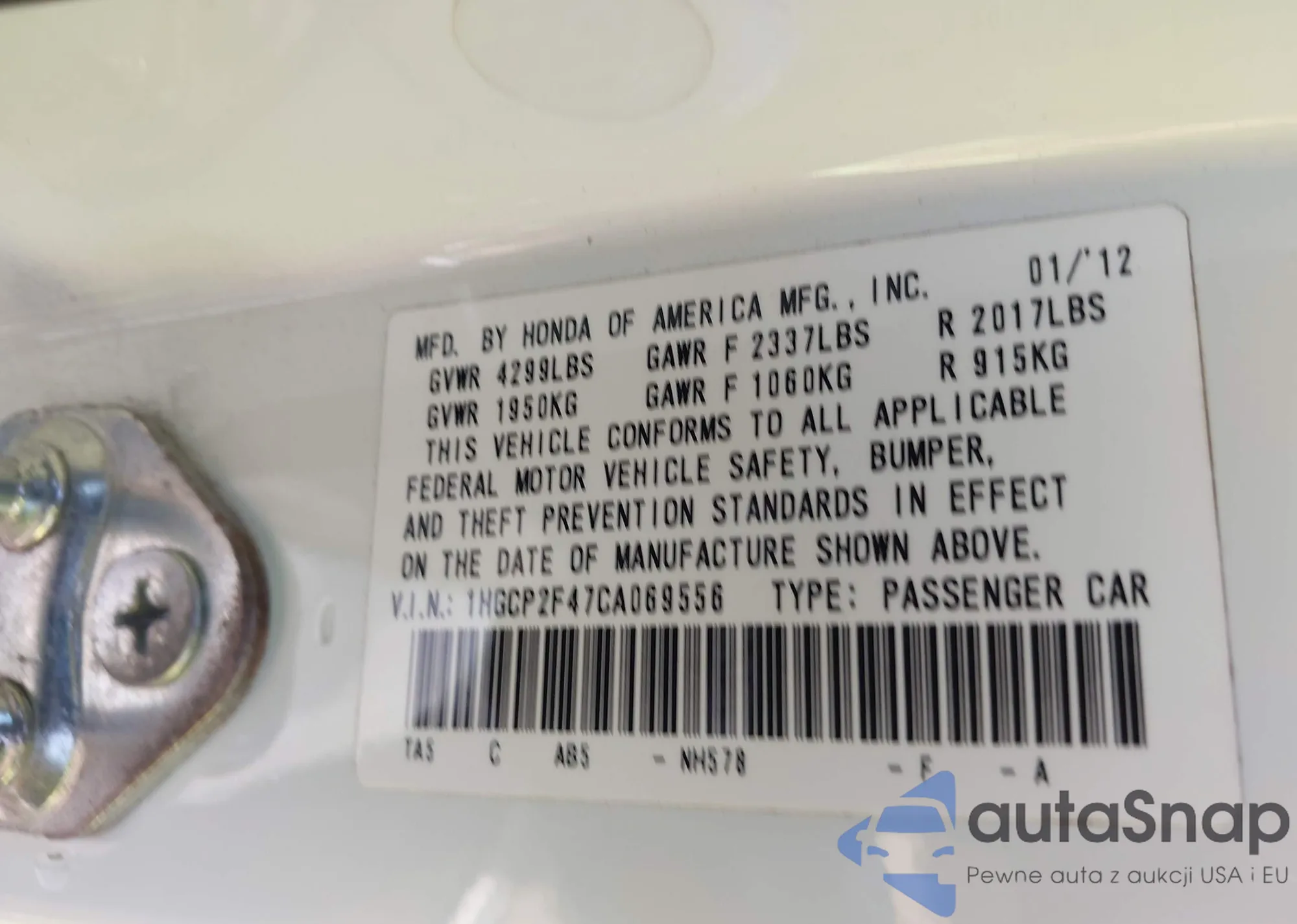 VIN: 1HGCP2F47CA069556