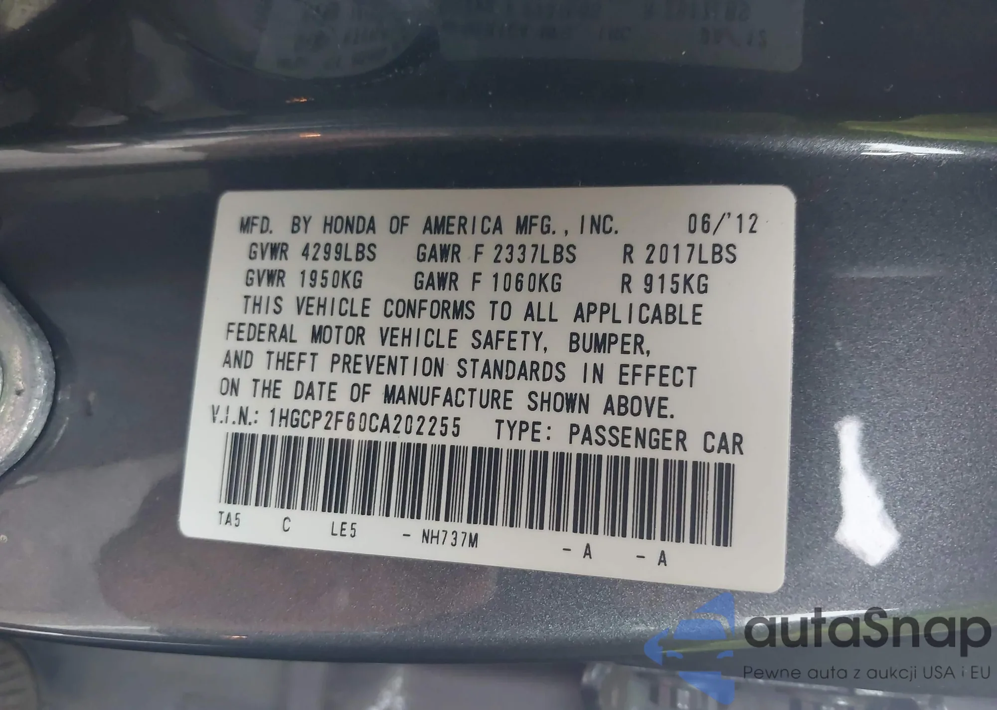 VIN: 1HGCP2F60CA202255