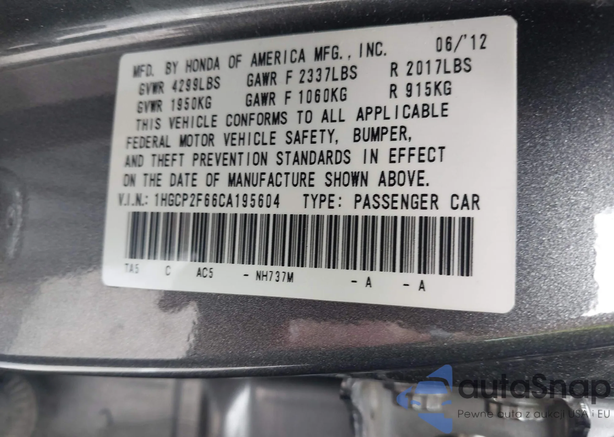 VIN: 1HGCP2F66CA195604