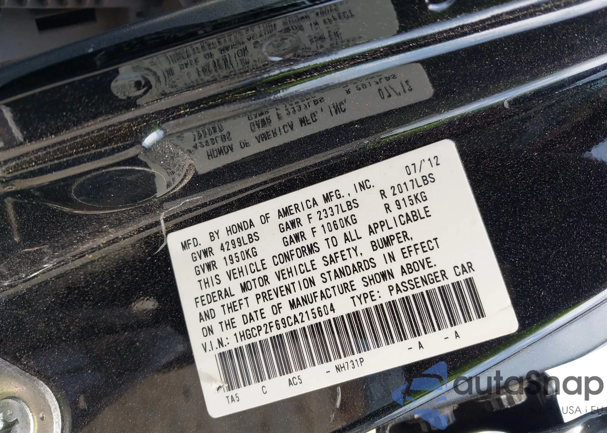 VIN: 1HGCP2F69CA215604