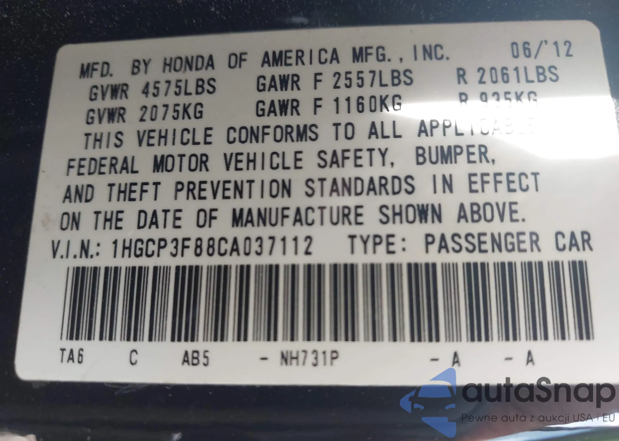 VIN: 1HGCP3F88CA037112