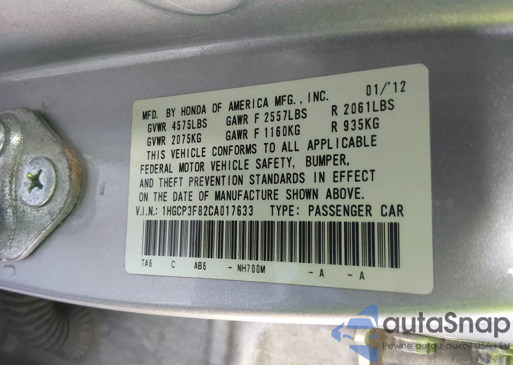 VIN: 1HGCP3F82CA017633