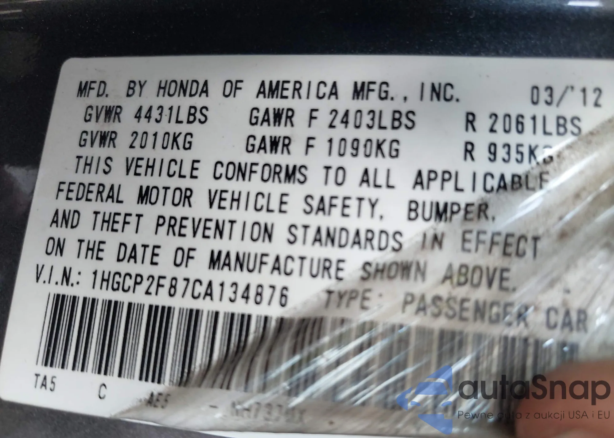 VIN: 1HGCP2F87CA134876