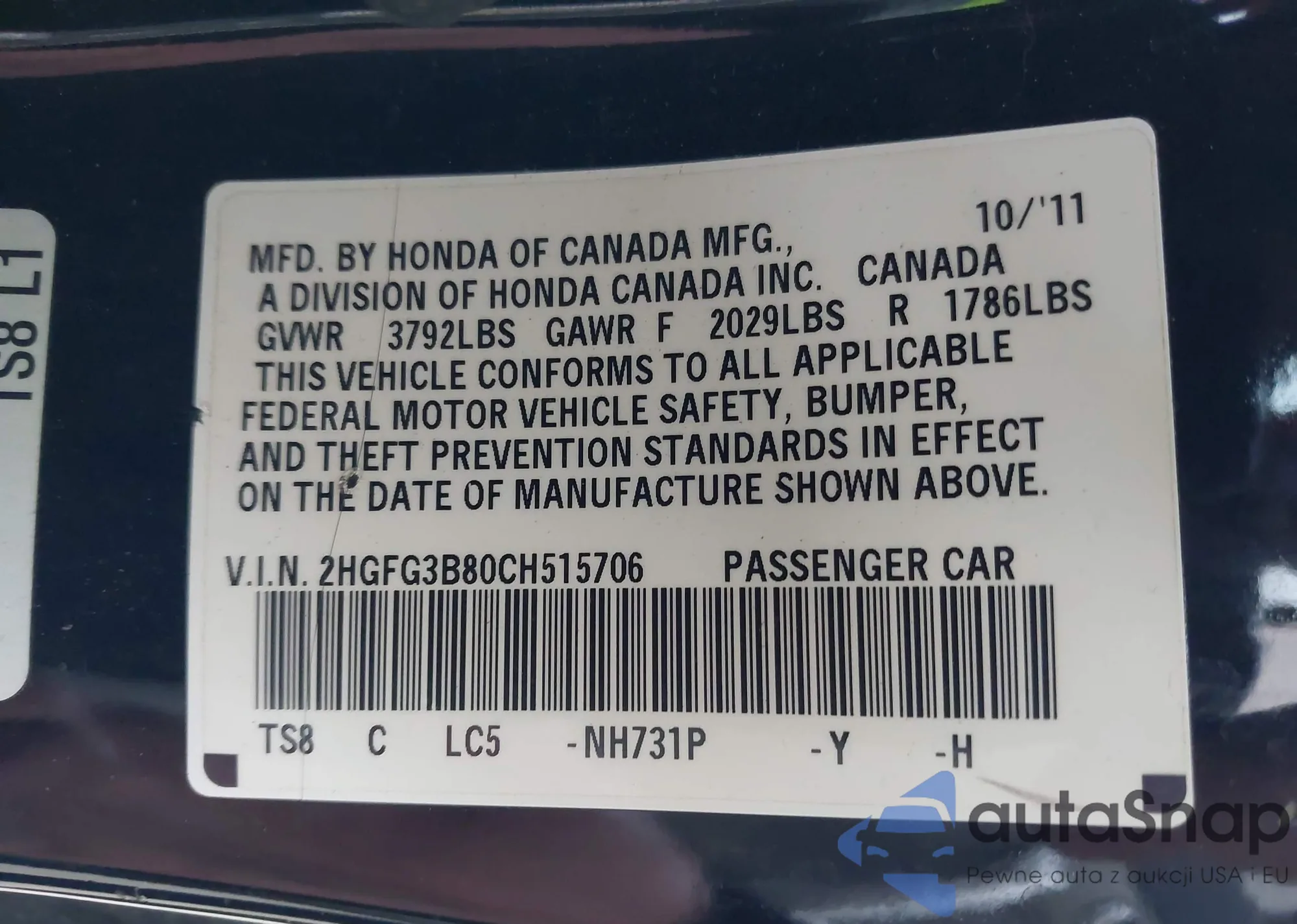 VIN: 2HGFG3B80CH515706