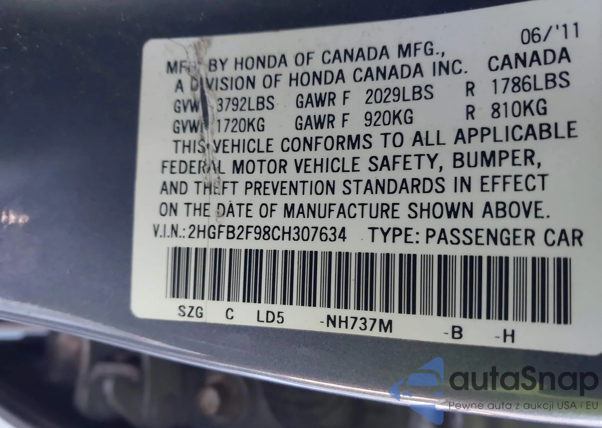 VIN: 2HGFB2F98CH307634
