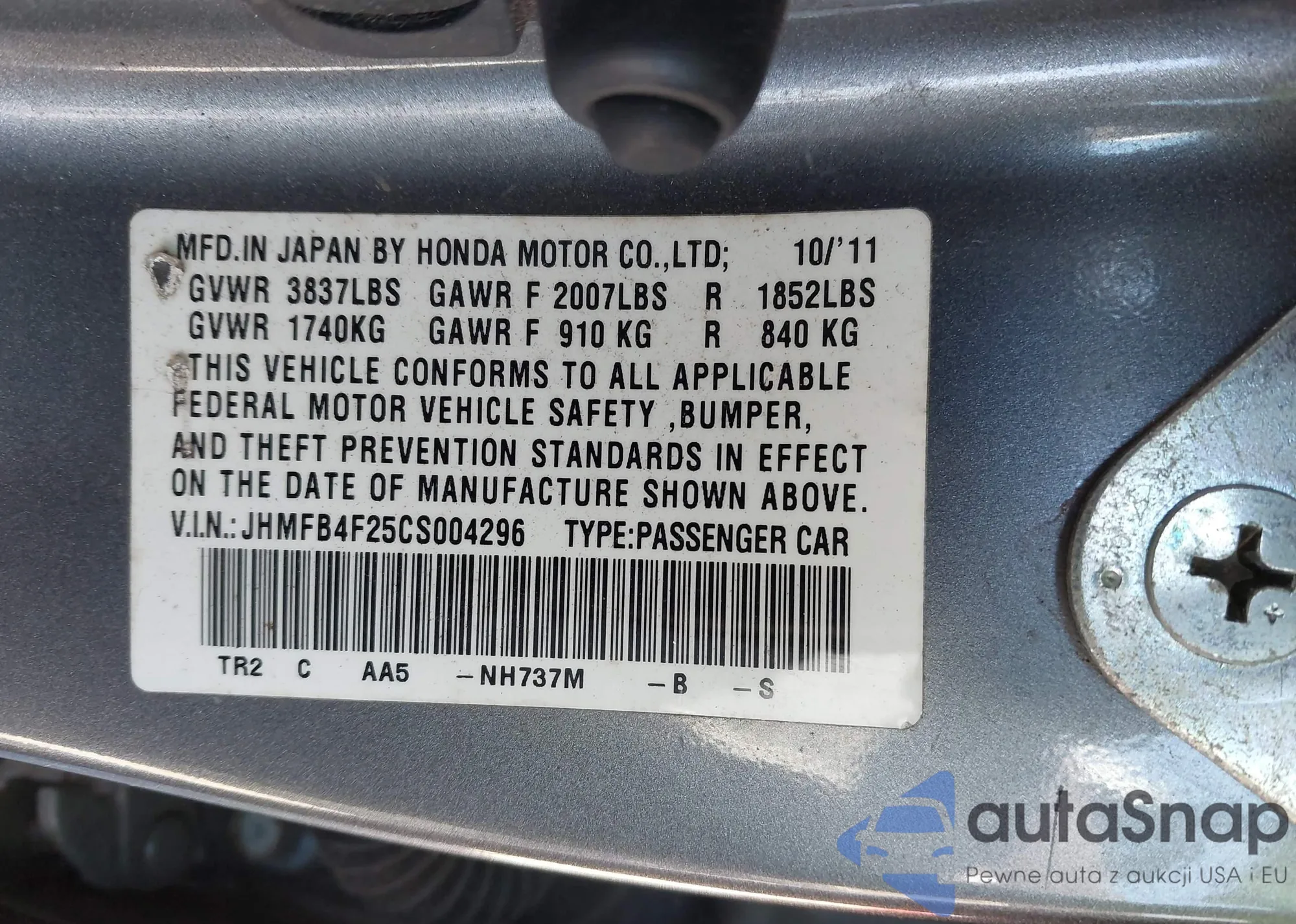 VIN: JHMFB4F25CS004296