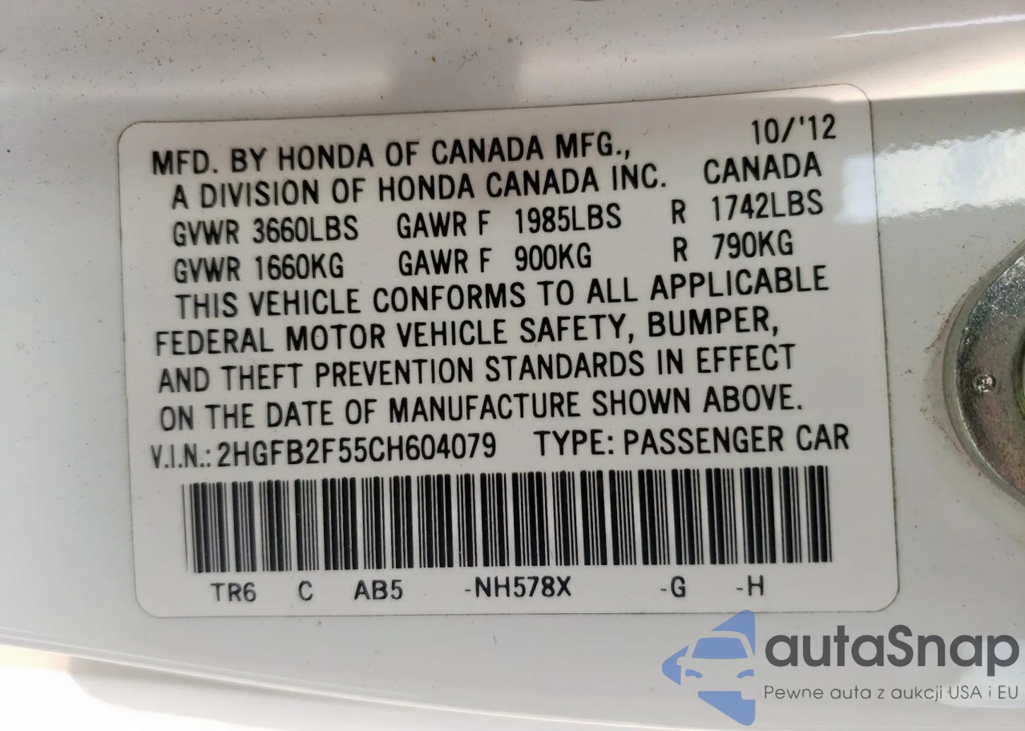 VIN: 2HGFB2F55CH604079