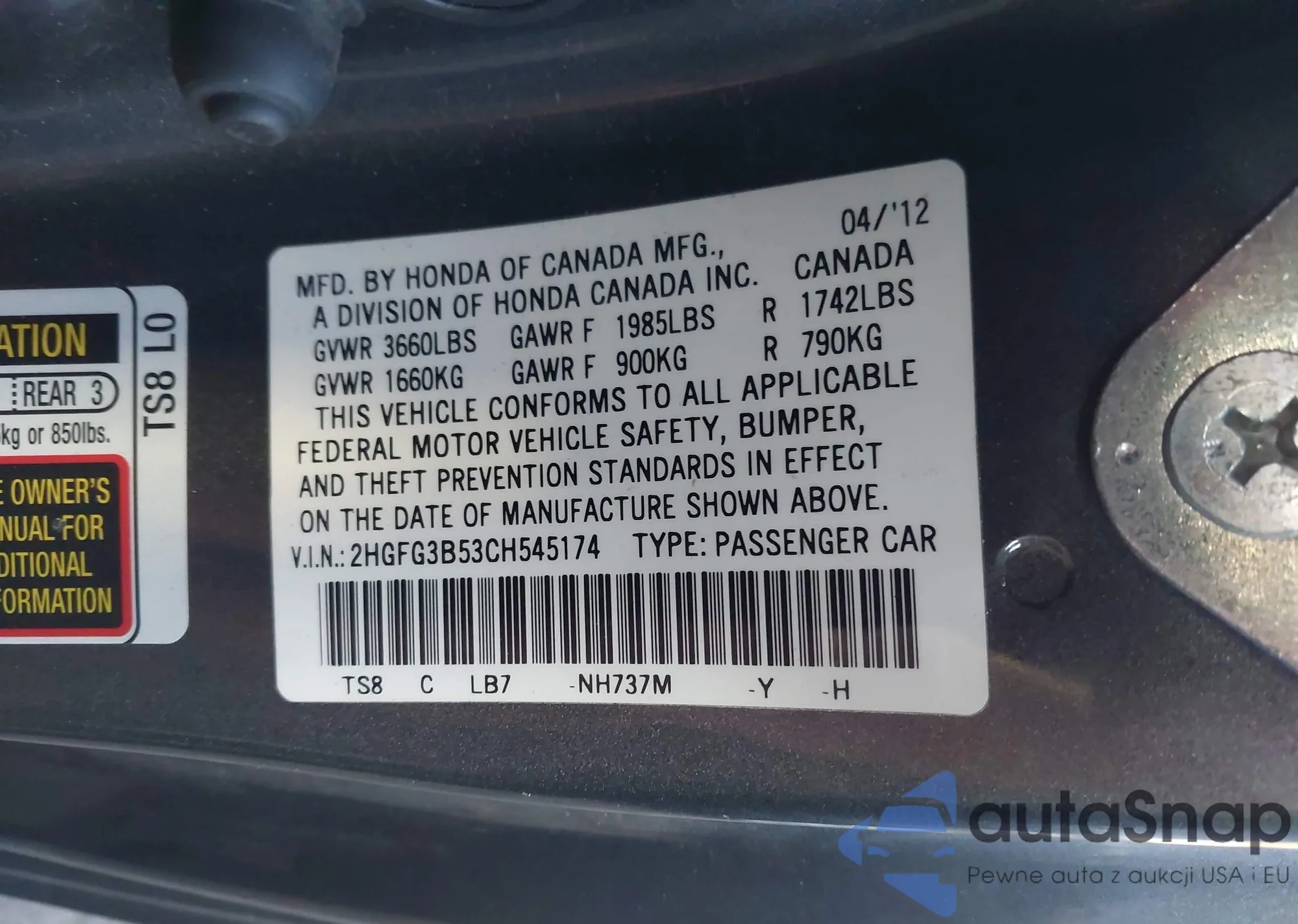 VIN: 2HGFG3B53CH545174