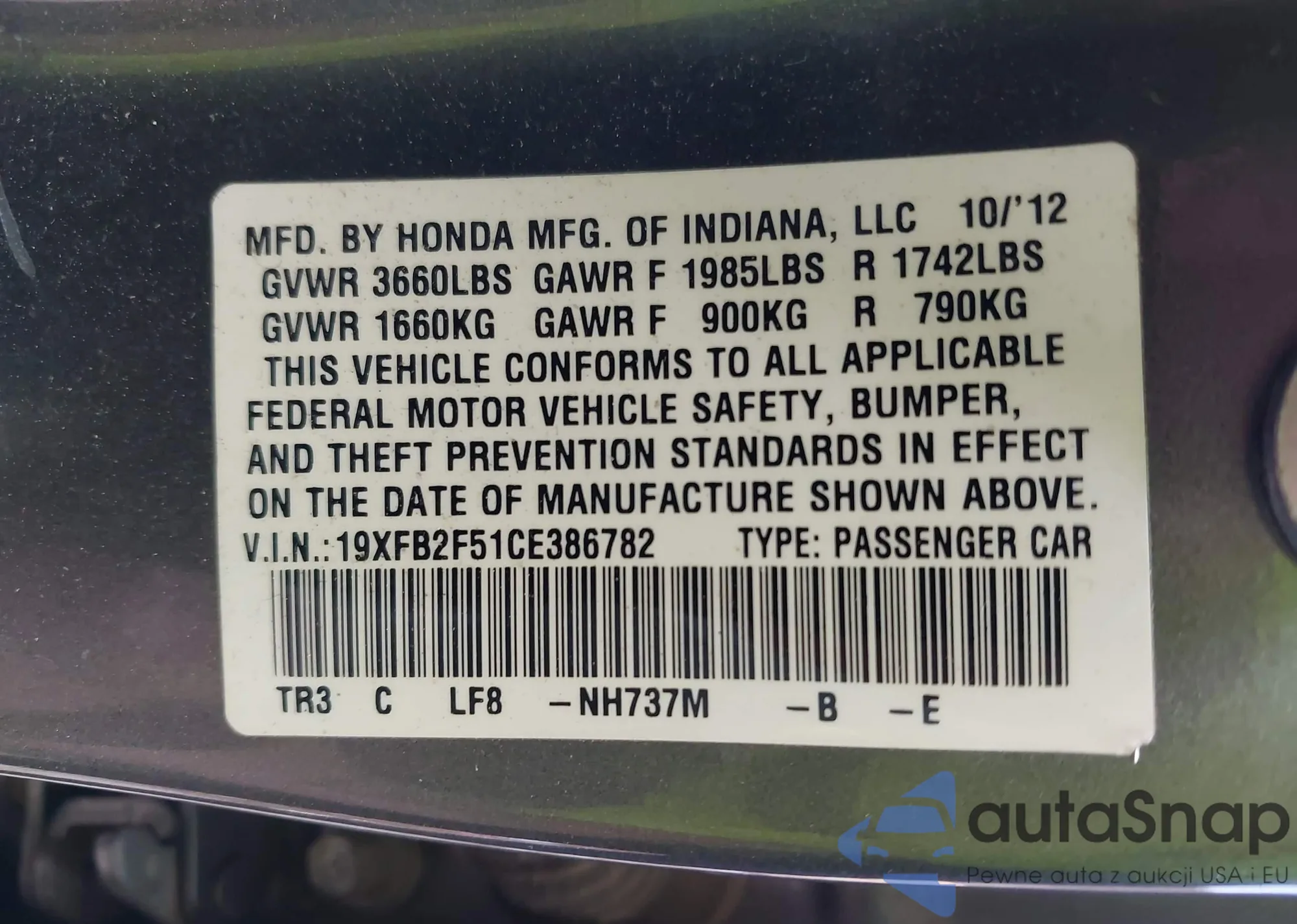 VIN: 19XFB2F51CE386782
