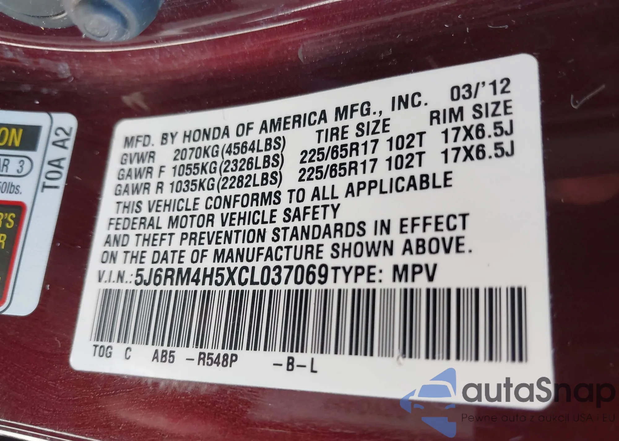 VIN: 5J6RM4H5XCL037069
