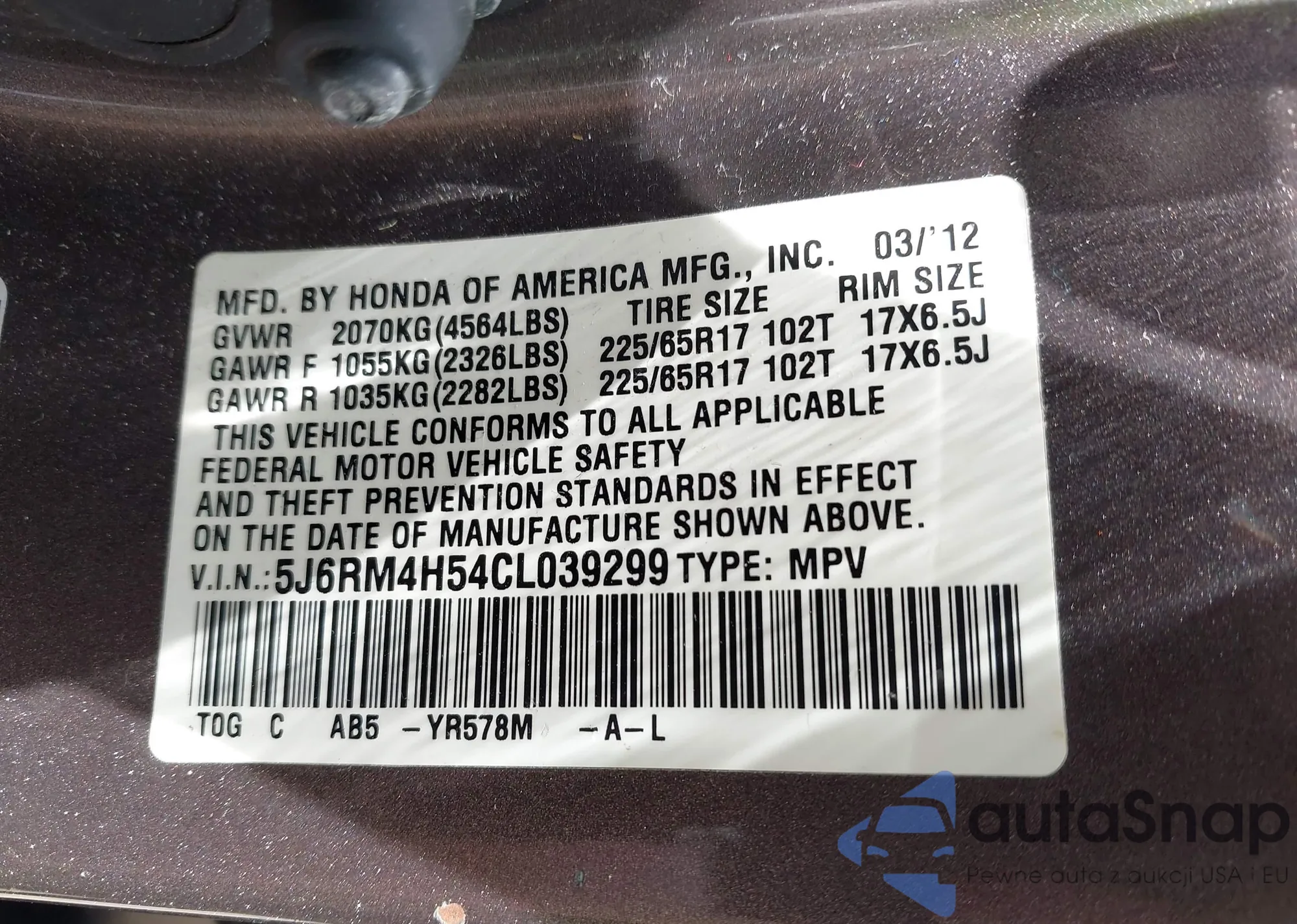 VIN: 5J6RM4H54CL039299
