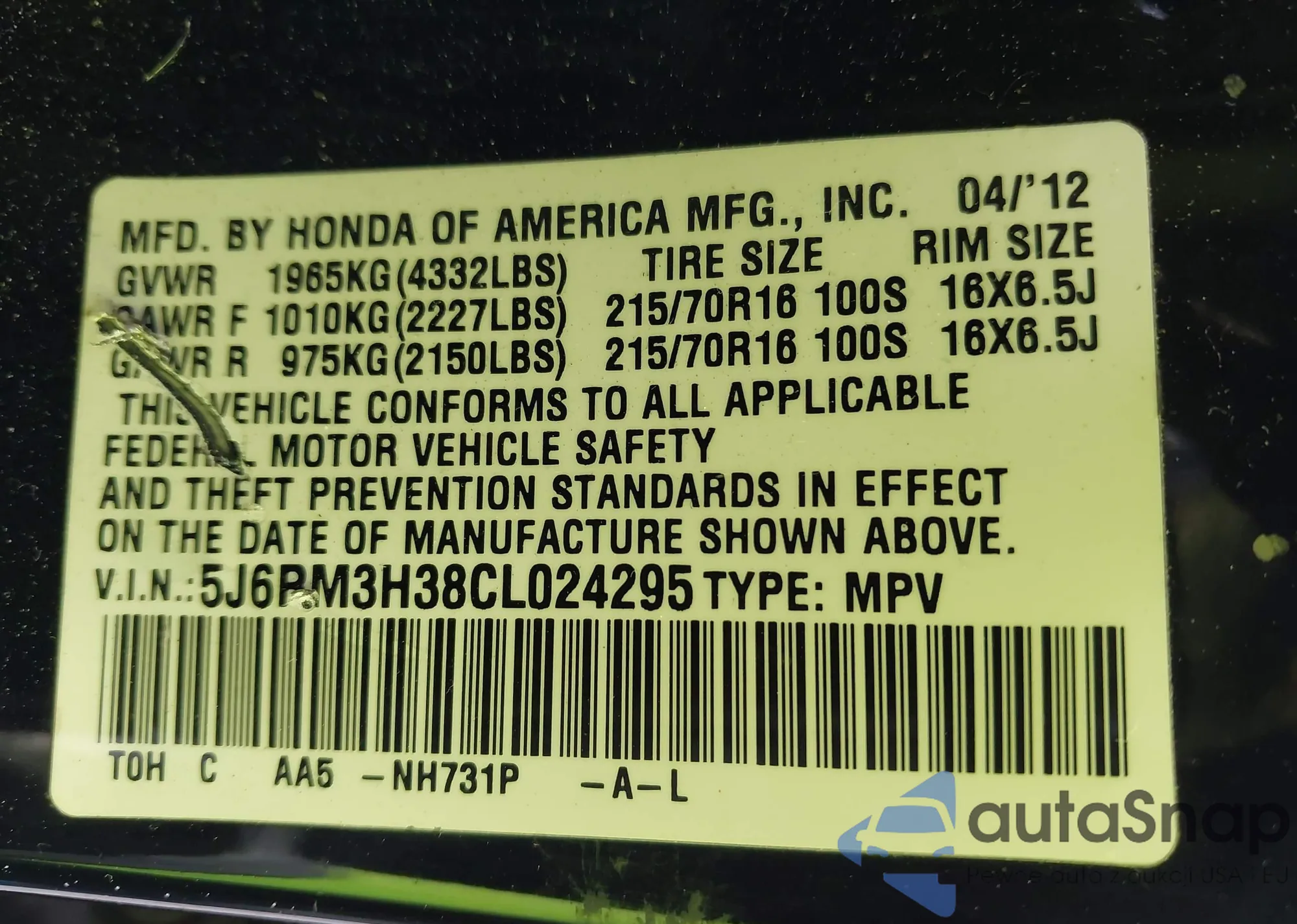 VIN: 5J6RM3H38CL024295