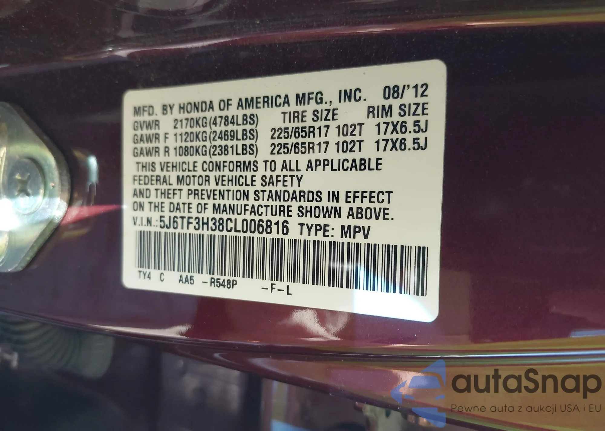 • VIN: 5J6TF3H38CL006816