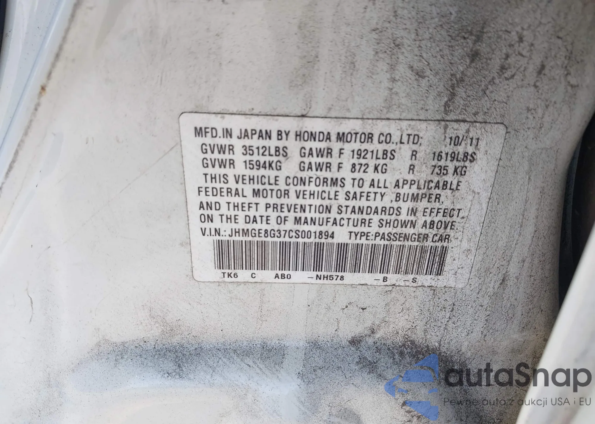 VIN: JHMGE8G37CS001894