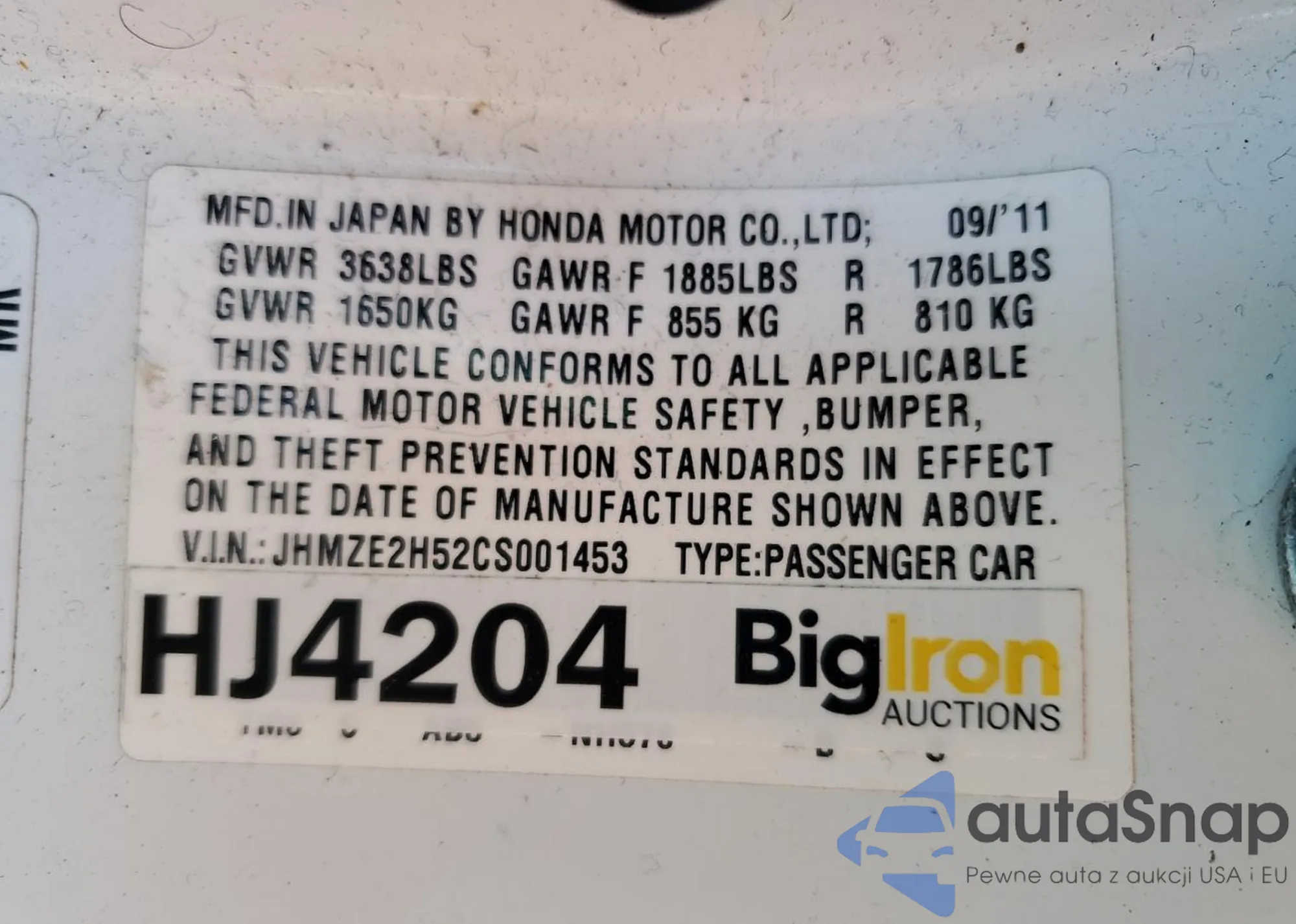 VIN: JHMZE2H52CS001453