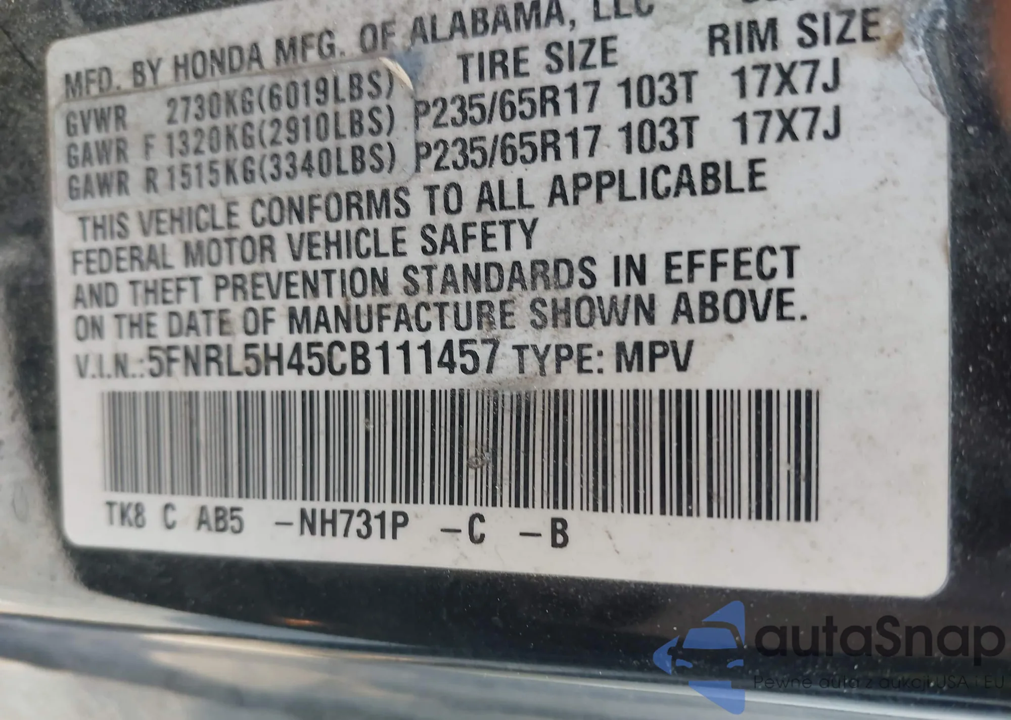 VIN: 5FNRL5H45CB111457