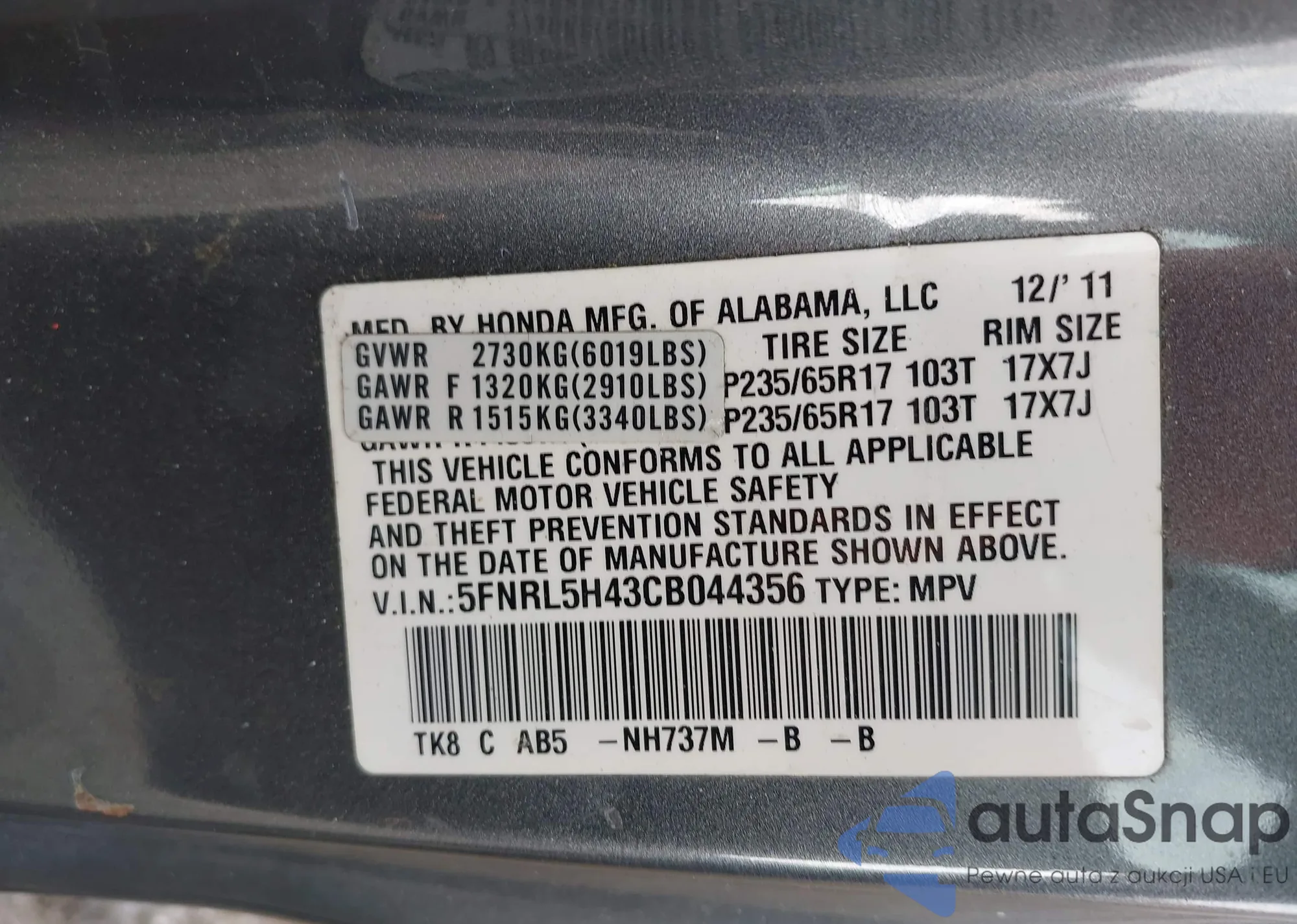 Samochód Honda Odyssey 2012 (VIN 5FNRL5H43CB044356) nie był wcześniej licytowany. Dokumenty są czyste, przebieg odpowiada lub jest niższy niż średnia rynku. Sprzedaje go firma ubezpieczeniowa – polecamy zakup. Dostawa do portu zajmie ok. 6–8 tygodni.