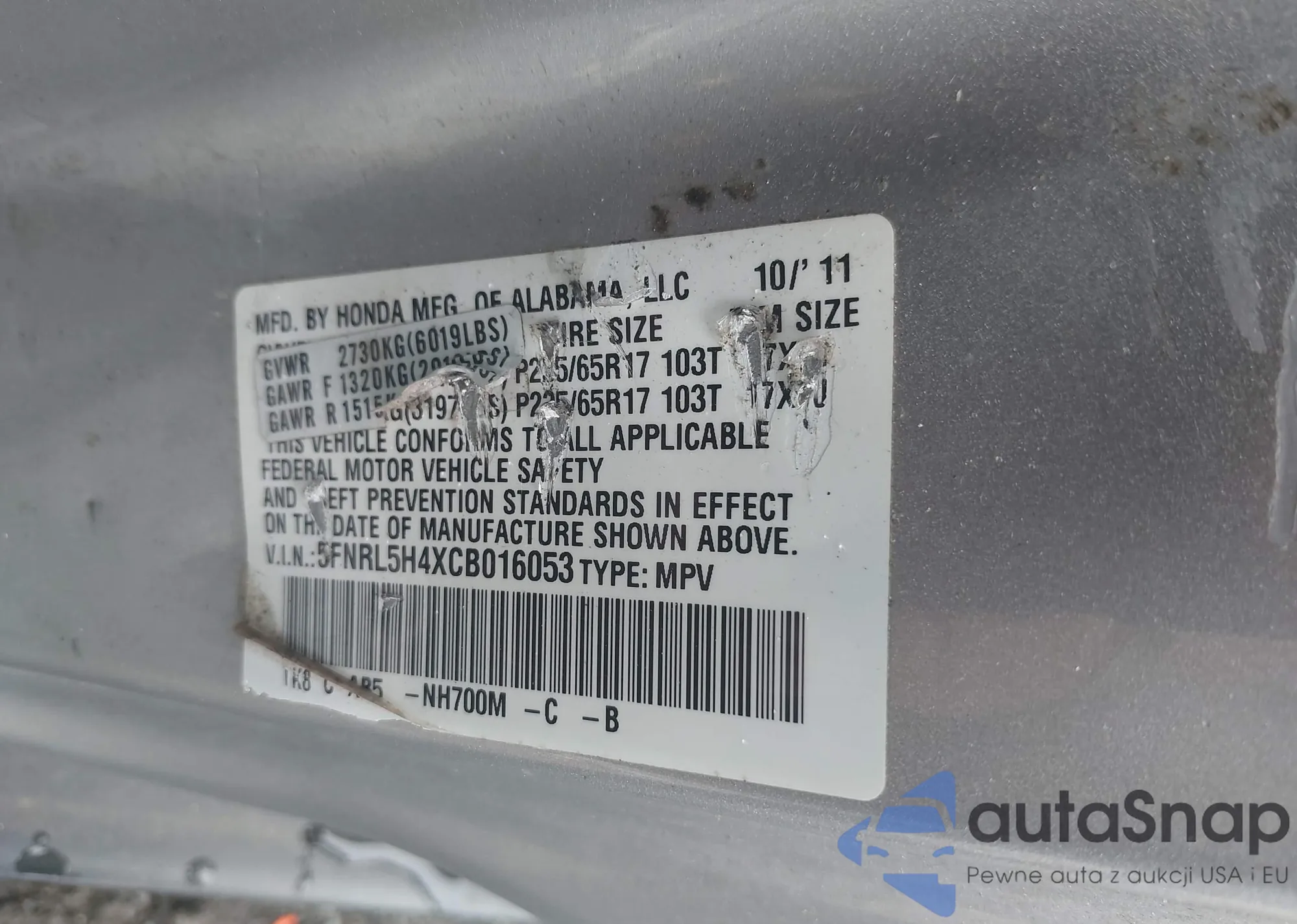 VIN: 5FNRL5H4XCB016053